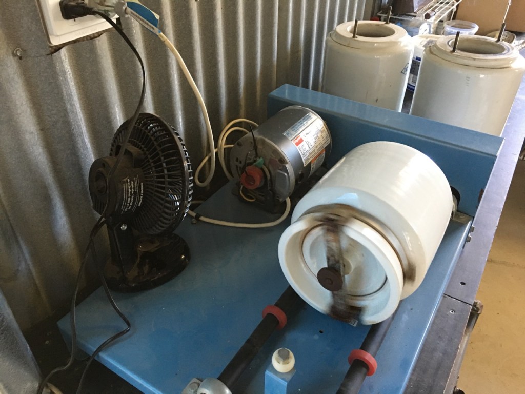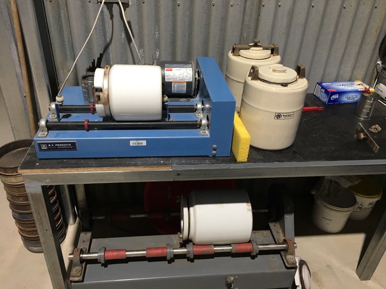 Len also located a very small ball mill unit in Melbourne that wasn’t being used and was able to be donated to me as a bush fire victim. It looked as though it had hardly ever seen the light of day. It came with 2 beautiful Daulton porcelain jars of about I gallon, or 4 litres, and a plastic bucket of small milling media to suit. The jars had some remnant brown dust in them, but looked as though they hadn’t been used very much.
