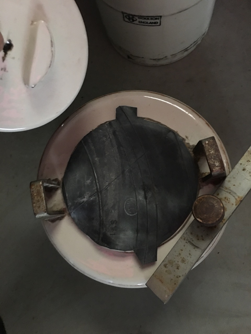 My friends have sourced some 2nd hand ball milling machines for me. Len Smith is always on the digital lookout for me for bits of equipment. He is so fantastically resourceful! He told me about a deceased estate of a potter. I turned up (before lock-down) and was lucky to buy what appears to be a locally made copy of a Shimpo ball mill roller and two 1 gallon, Chinese made porcelain jars. One was broken on the shoulder near the locking stud and the other has a brittle, seized rubber ring seal. Was able to prize the stuck lid off with a chisel. They both need some work. But I was lucky to get them. I made a new silicon rubber seal for the seized and a flat rubber washer type of seal for the other.