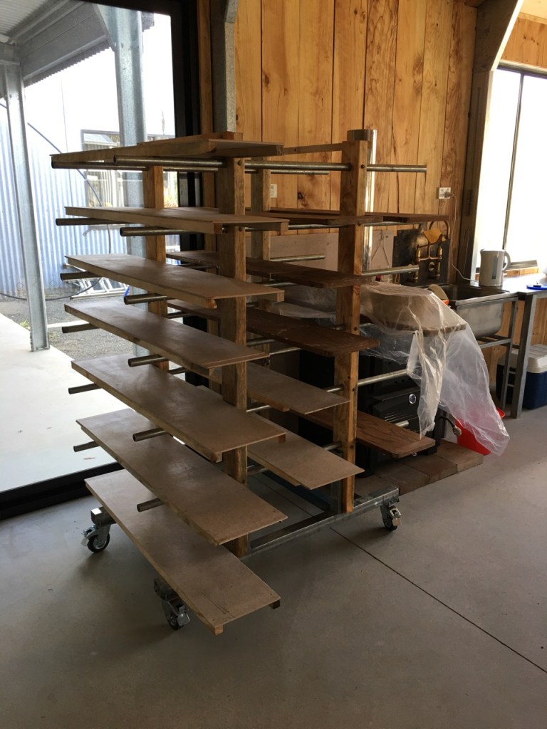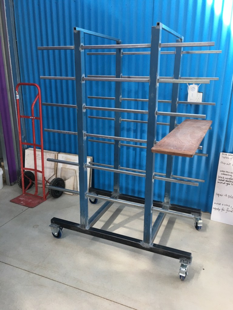I made a couple of stillages on castors to hold the pot boards in a compact and movable form. The first set I made from leftover parts of the brickies’ scaffolding. I don’t like to see waste, so i kept the parts after i dismantled the scaffolding. The other set I made from steel, half of which was left over from the shelves and benches that I made for the Gallery and lab rooms. These shelving racks can hold 28 pot boards if they ever get filled. More than enough for us.