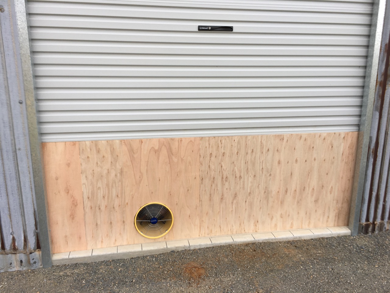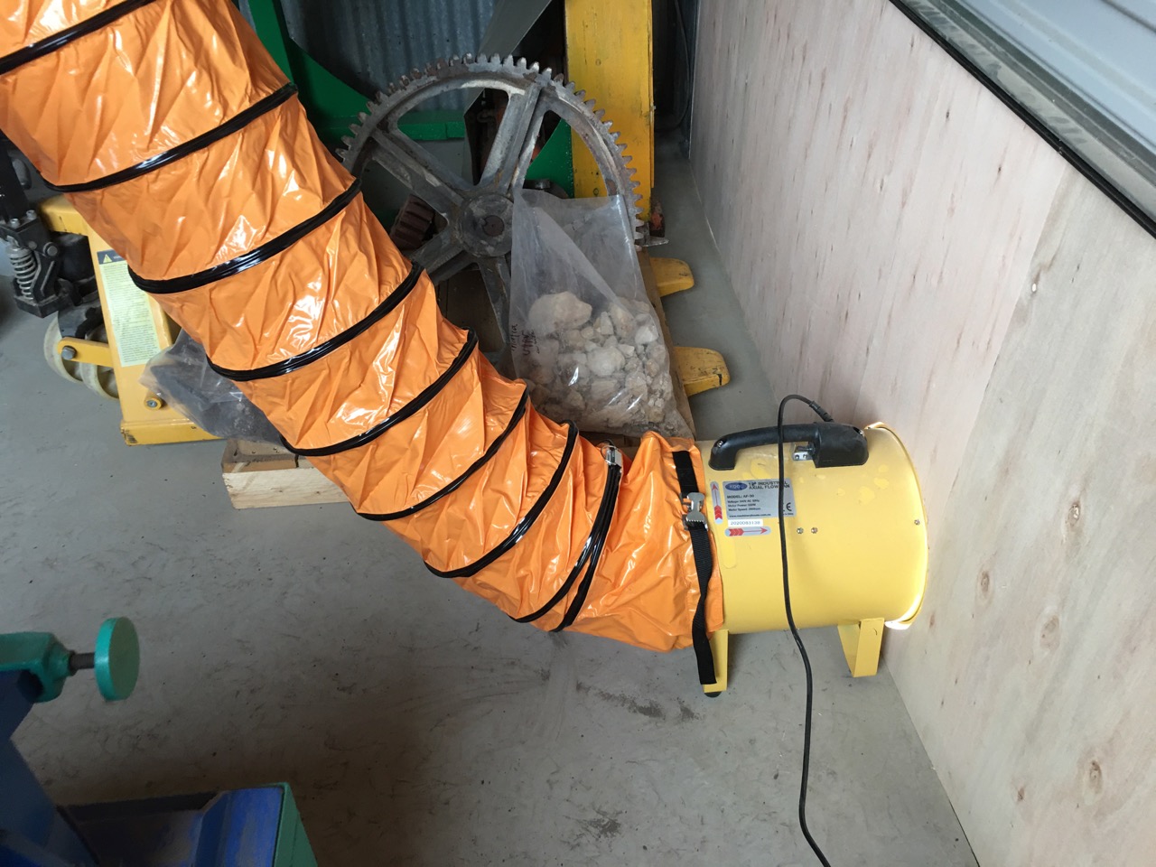 I have installed a flexible dust extractor system that sucks the dust from the machine out through a fan installed in a sheet of plywood that fits in the roller door space. It is quick to install and remove afterwards. This was the quickest and cheapest DIY solution to the OH&S dust problem involved in crushing rocks, as i had the sheet of plywood left over from the ceiling of the throwing room.