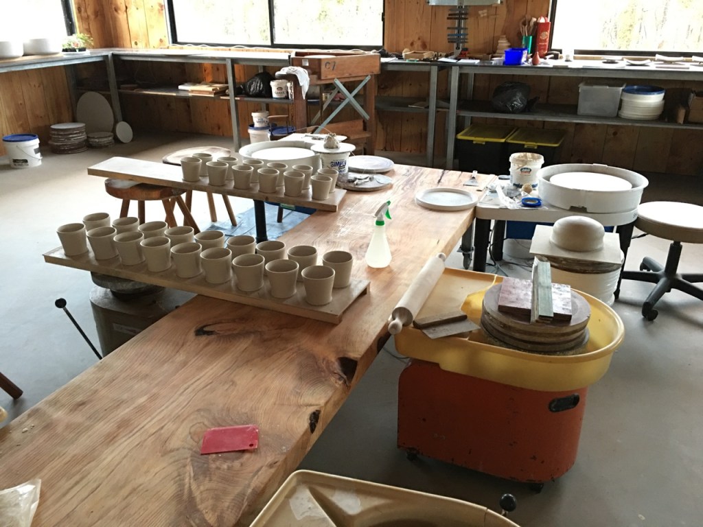 Now that we finally have a continuous, flat, level floor, we can wheel our work between the throwing room, kiln room and glazing rooms as needed. So easy and convenient now. What a luxury!