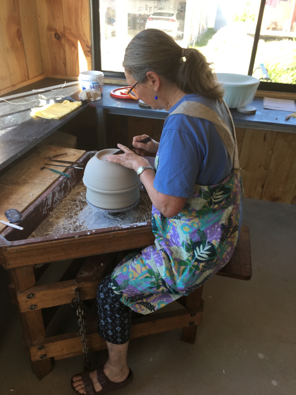 Meanwhile, Janine is at work making larger bowls on the ’Slatyer’ kick wheel.