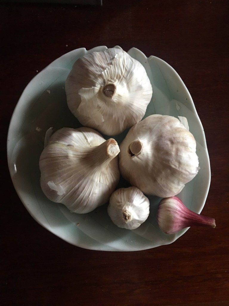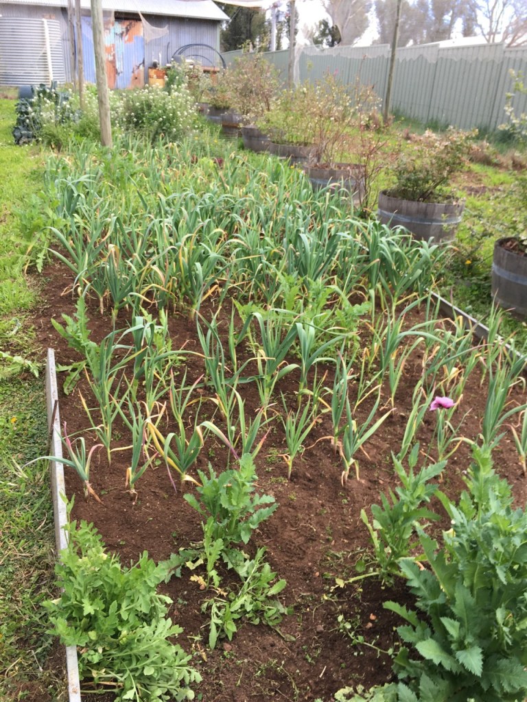 We have just one small bulb left of last years harvest, so I bought 3 knobs from the green grocers last week. These are imported from the northern hemisphere where they are in the opposite season. Janine also picked one very small bulb that had fallen over near the garden path. It wasn’t going to do well, so it’s our first bulb of the new season.