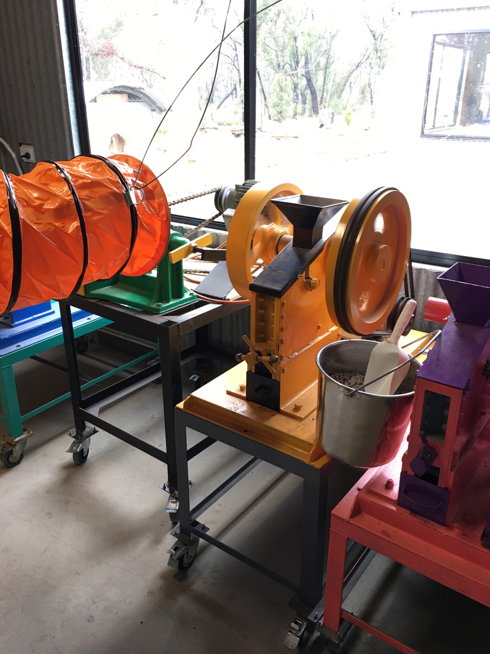 Straight off, there was one casualty. The smallest laboratory jaw crusher just doesn’t seem to work at all. I got it 2nd hand from a junk yard. I tested it, the motor ran, the shaft turned, it whirred and clanked, but now that I go to use it, nothing happens when I put rocks in. They just sit there bouncing around. Luckily, I only paid $250 for it. I’ll need to pull it to bits and find out why. But that will have to wait till later, much Later… I have other machines that do actually work and they are enough to get me started. What’s most important is that I can get some local stones powdered so that I can get a glaze firing full of test pieces done.