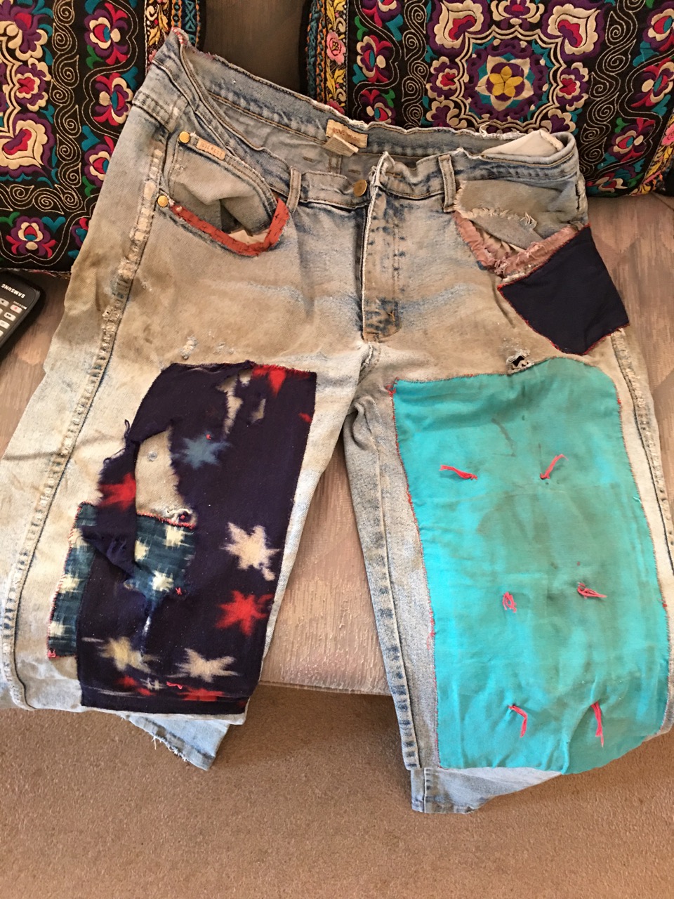 It’s just one more example of built in obsolescence. A product designed to fail. The retailers hope that i will just ditch the whole pair and buy another – in the latest fashion style! Well I won’t and don’t. I repair, re-use and re-cycle. I like to make them last me a decade. They start out as being for ‘best’ , going out etc. Then after a couple of years, they start to get a bit past their shiny best, they are worm in the pottery and for gardening. Finally after another 3 or 4 years, they are reduced to the welding workshop, rock crushing and angle grinding. This really takes it’s toll and they require more patches more often. In the past I have finally given up on them when I grew out of them and had to go up to another size. Then they became rags for painting and cleaning. These days I don’t get any bigger, so size isn’t the death knock that it used to be. Hence I a back log of three pairs of these patched jeans that just keep on being repaired and worn again and again.