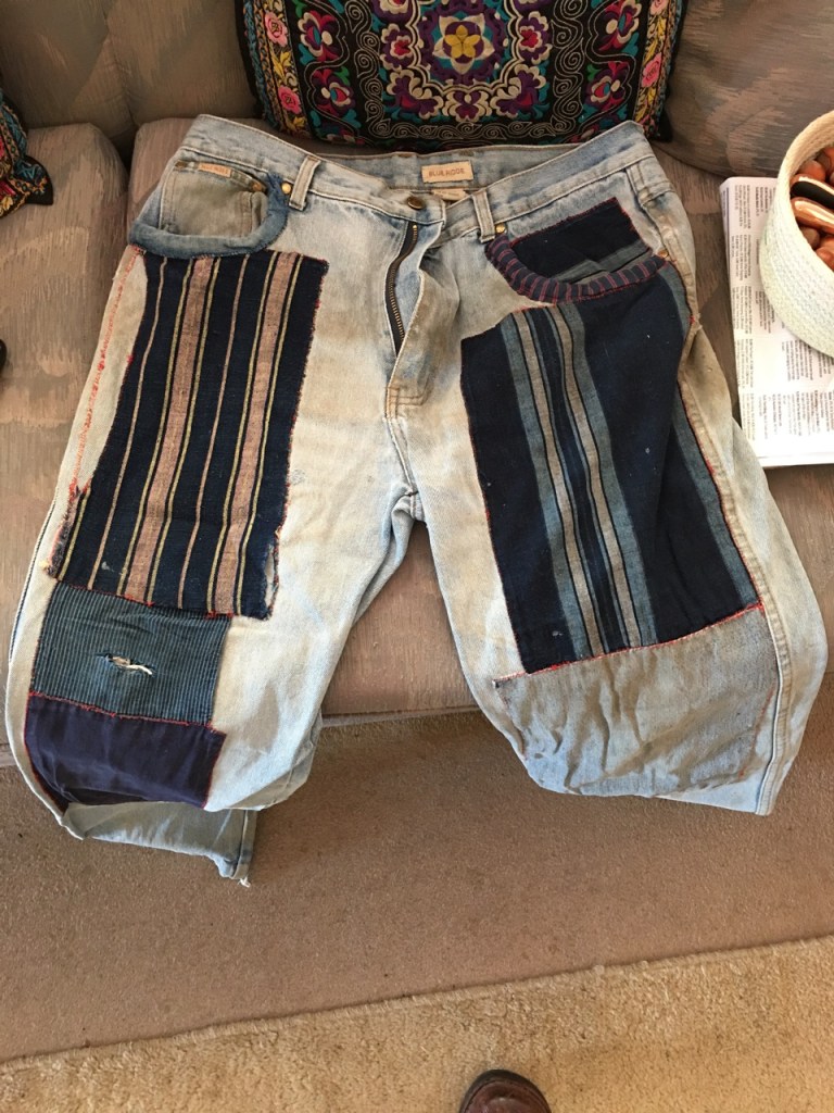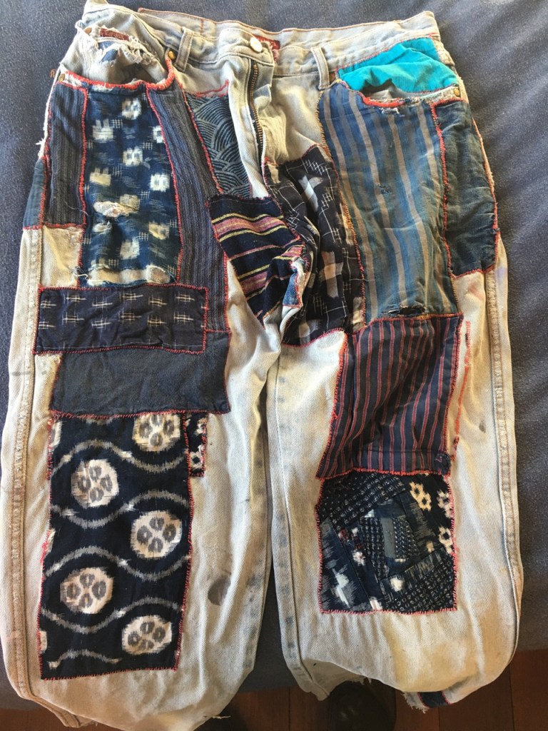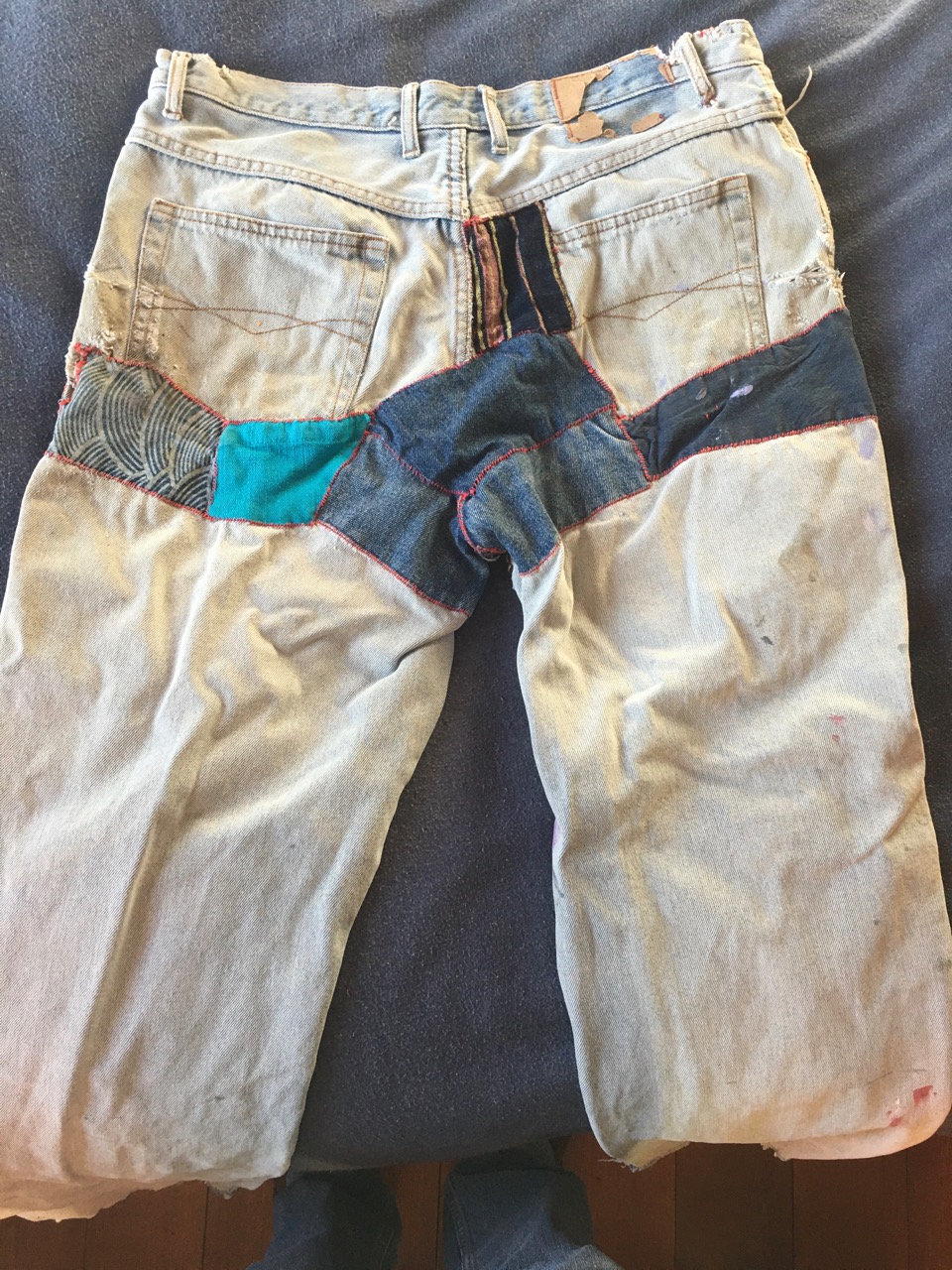 I think that ongoing hand stitched repairs like this are an important aspect of my creative expression. I exhibit my pots , but no one ever sees these creative endeavours. They are strictly utilitarian and for home use only, but this doesn’t meant that they are any less important. I kintsugi my pots and I patch my clothes. It’s the same thing.