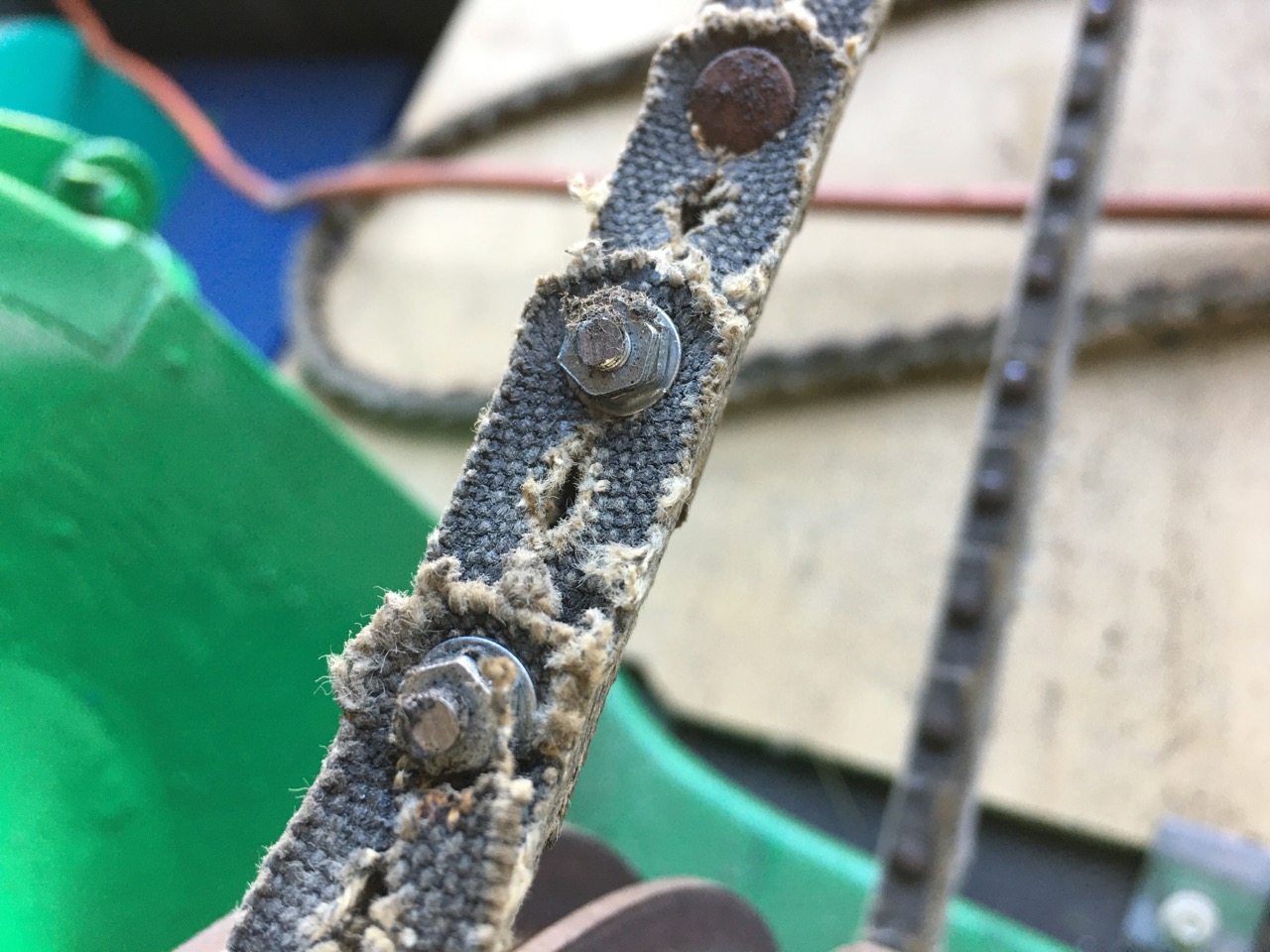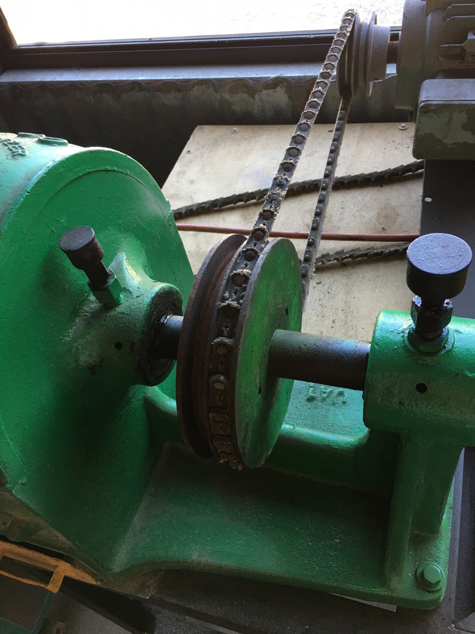 To get this disc mill working again, I also had to learn how to make, break and fit segmented leather drive belts, as the drive pulley is completely enclosed within the cast iron frame of the machine. I had to thread one open end of the broken belt through the frame and then rejoin the belt. I couldn’t find any way to extract the rivets easily from the segmented belt, so I just cut the head off two of the rivets and then replaced them with small bolts and washers. It seems to have been successful. It works! But I’m not too sure for how long?