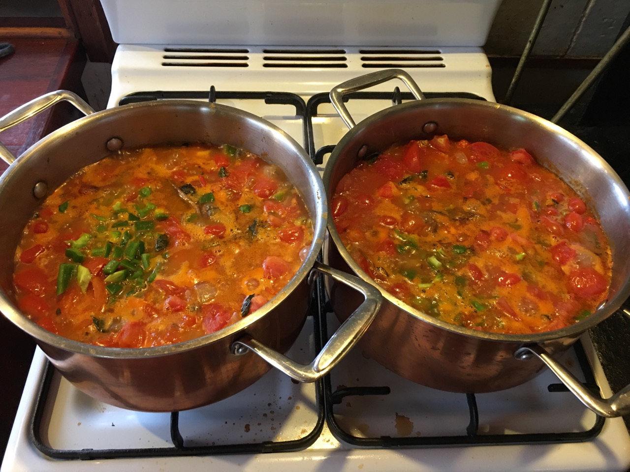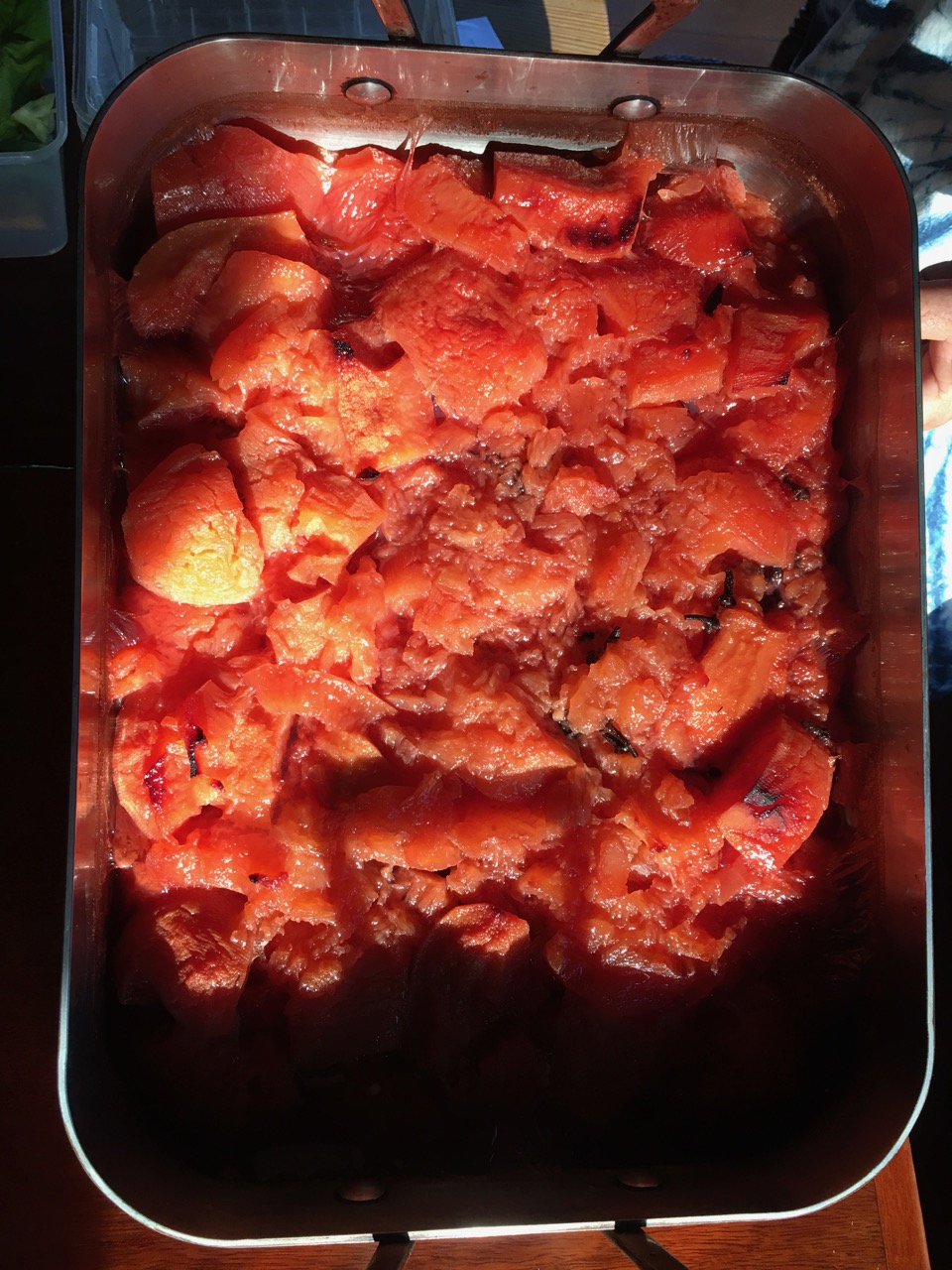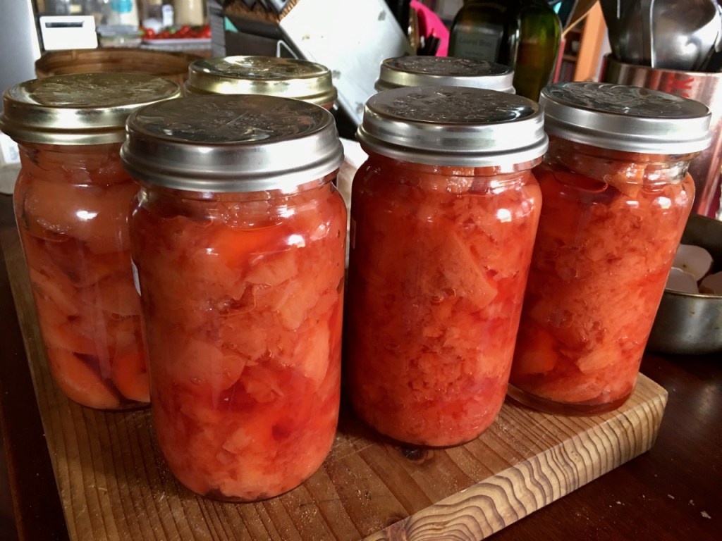 We have a glut of tomatoes this last week. The picking got ahead of our ability to consume them, so it was time to make up another big batch of ripe tomato passata.