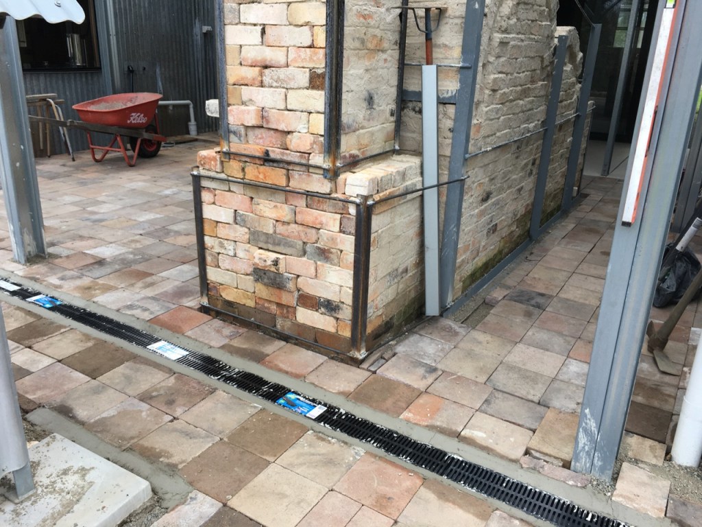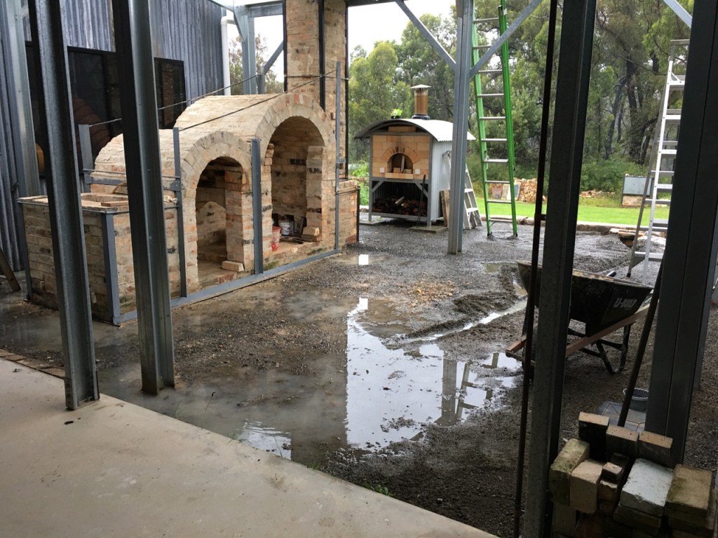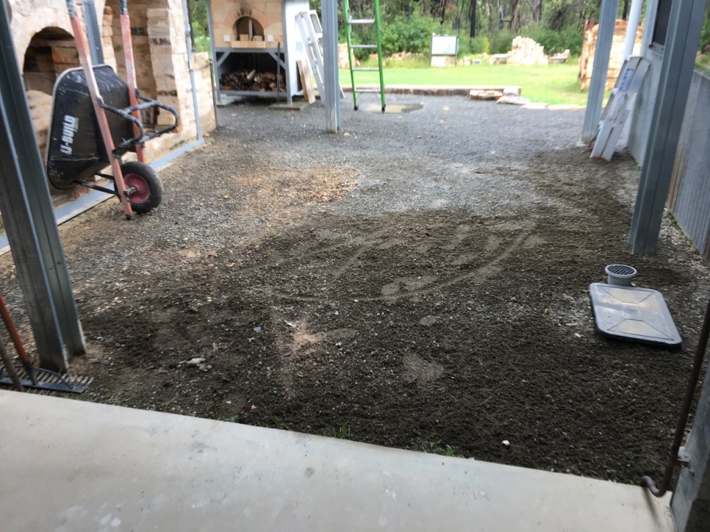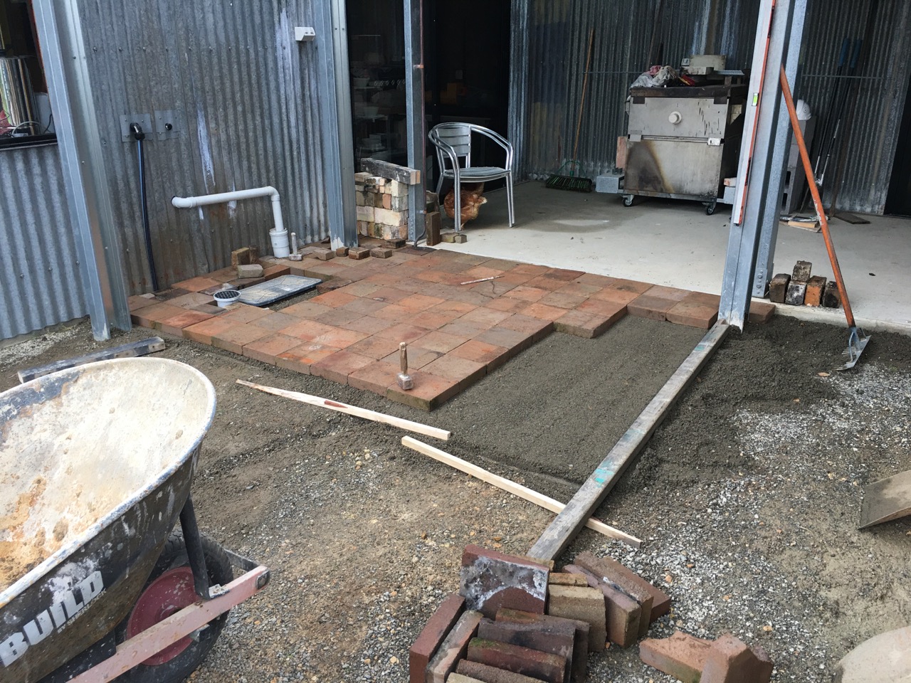 I removed one single line of tiles, dug down into the gravel substrate and positioned a cheap plastic drainage gutter in the space and then cemented it in. When we have another rain event of biblical intensity, I want the water to flow away from the kiln and be easily removed instead of soaking in.