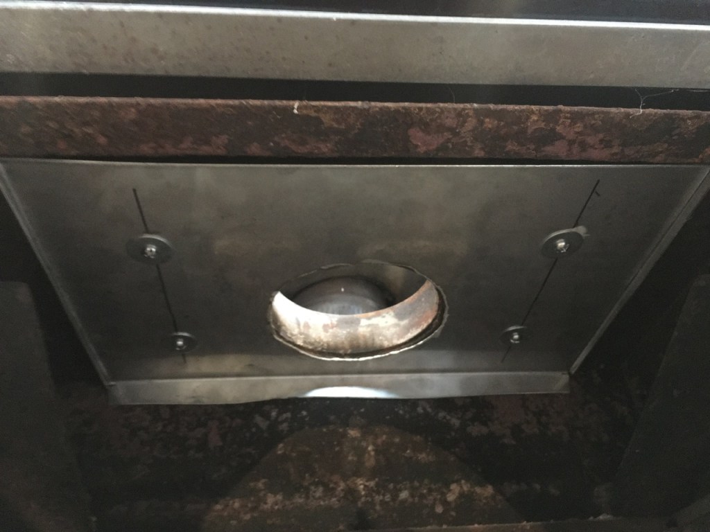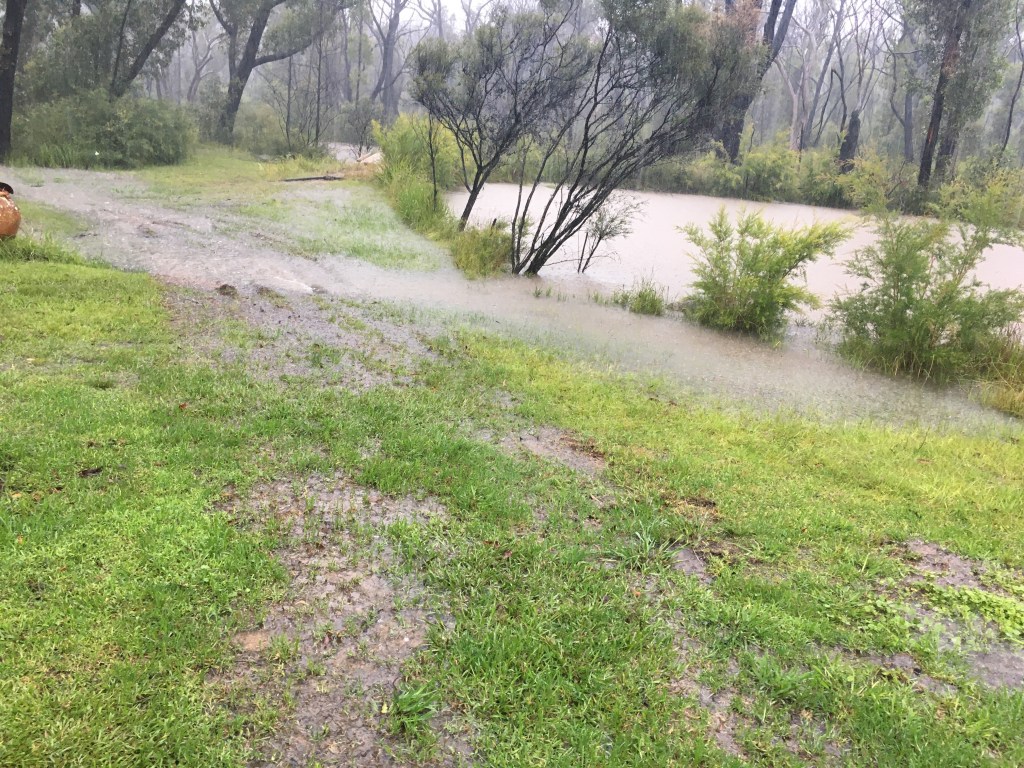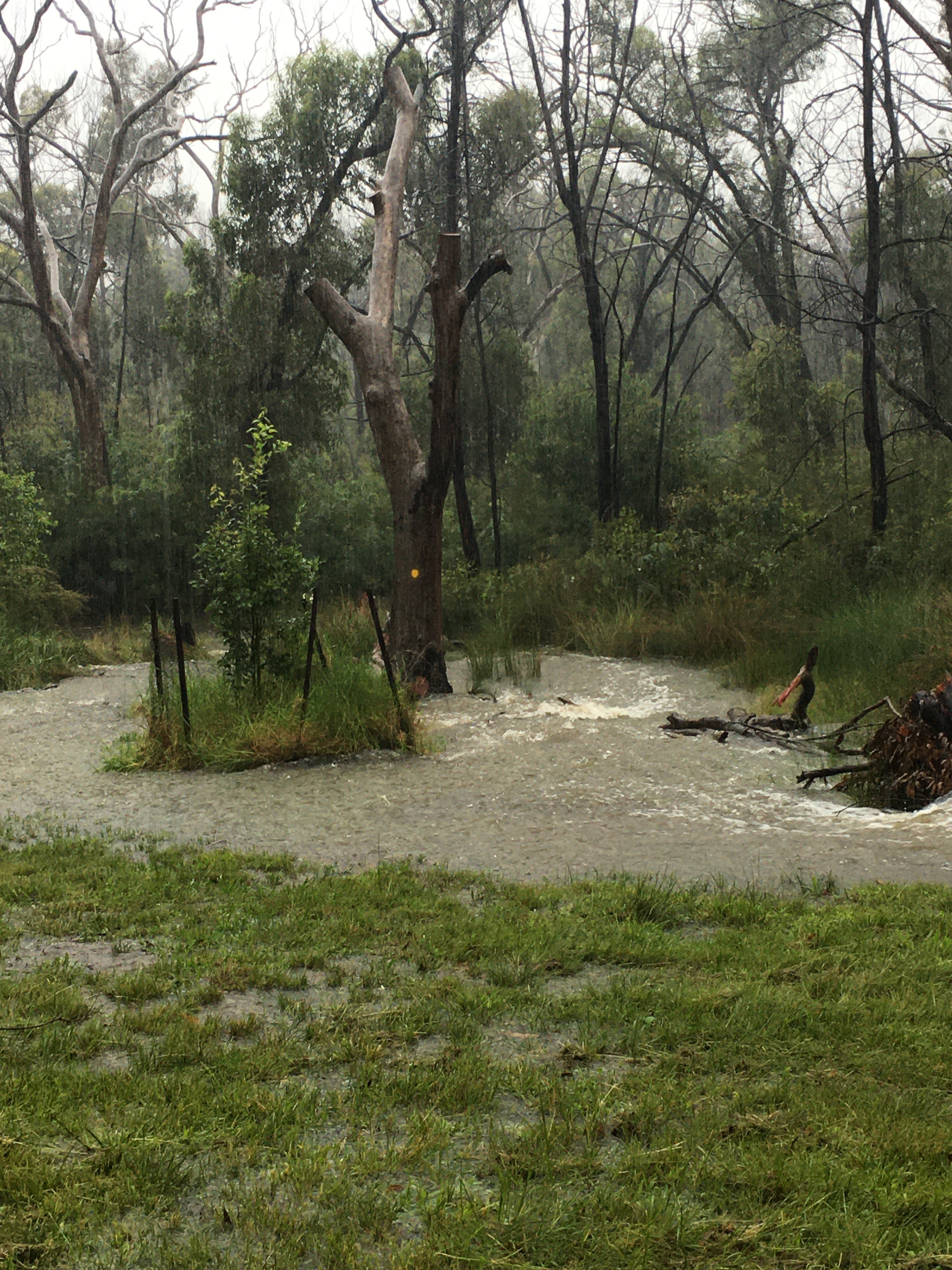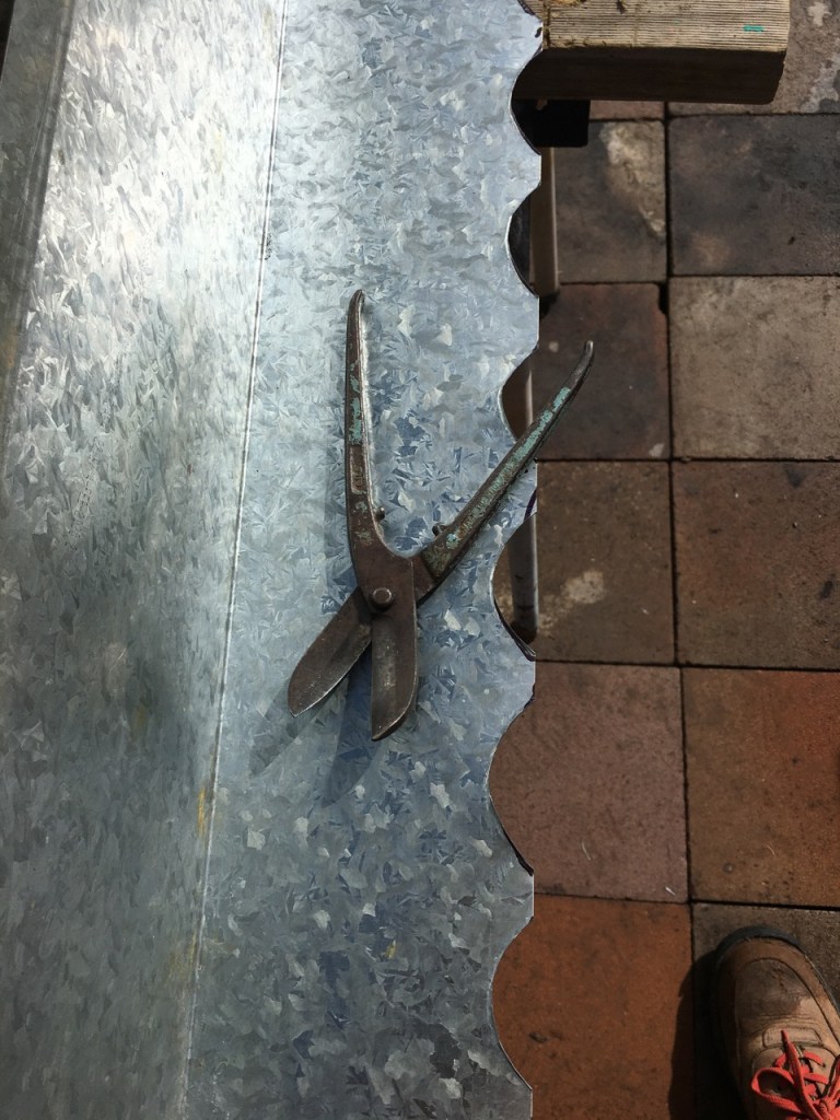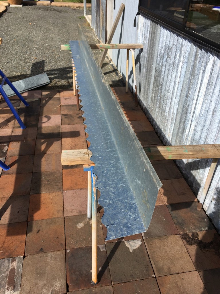 I removed one single line of tiles, dug down into the gravel substrate and positioned a cheap plastic drainage gutter in the space and then cemented it in. When we have another rain event of biblical intensity, I want the water to flow away from the kiln and be easily removed instead of soaking in.