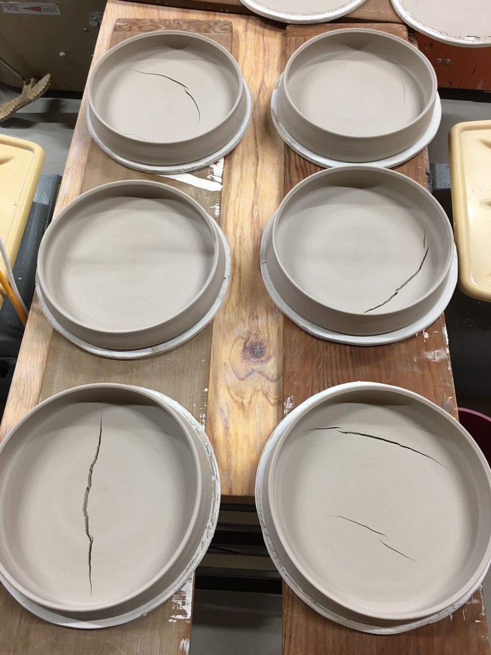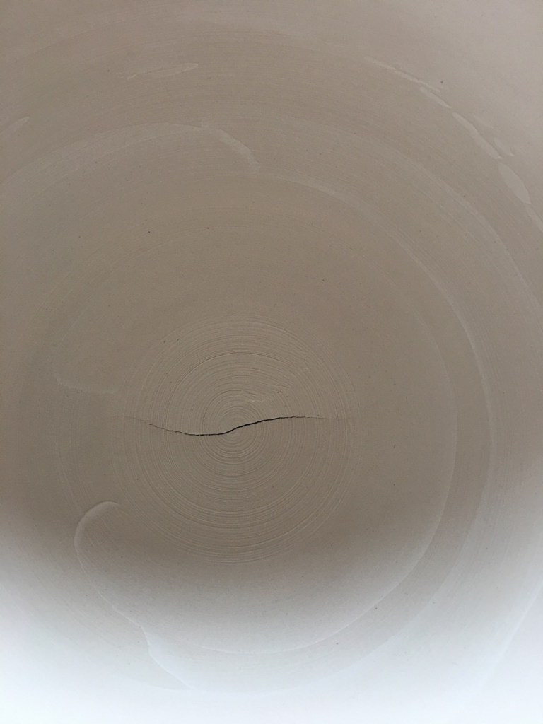 I put it down to being out of practice and being distracted, with so much else on my plate. I pugged up this first batch of pots, re-worked the clay and threw it again the next day. The second batch, I cut off with a very fine wire and dried very slowly in the damp cupboard for two weeks. Cutting them off the batt again every 2 or 3 days, to allow them to separate from the base and shrink evenly without too much stress. This has worked. I am amazed how easily this strange stuff sticks itself back together again so easily. I have found that if I use a thicker twisted wire, they stay separated, but almost all of them crack against the line of the cut.