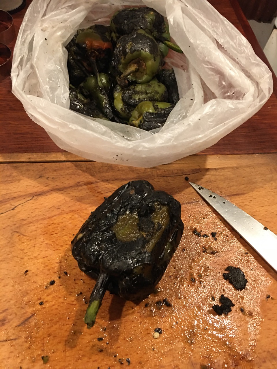As we have a lot of capsicums at the moment, I roasted the excess over the open flame on the cook top, sweated then out in a bag for an hour and when cooled, I pickled them in a little oil and vinegar. Preserved for later.