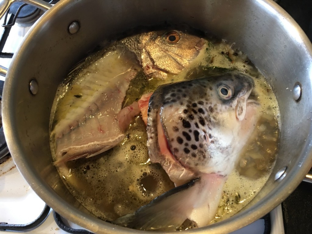 I had filleted a whole snapper the night before for our dinner, so had the fish frame to make stock with. I also bought a salmon head at the fish markets while I was buying all the seafood for the bouillabaisse. These two fish heads and frame made a great start for the stock.