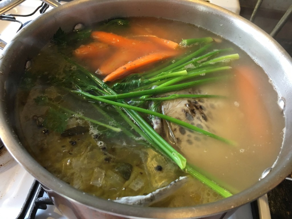 I started the stock with a bouquet garni of fresh garden herbs and onions fried in olive oil. Added the fish heads along with carrots picked freshly from the garden, some very young celery stalks, capsicums and parsley.