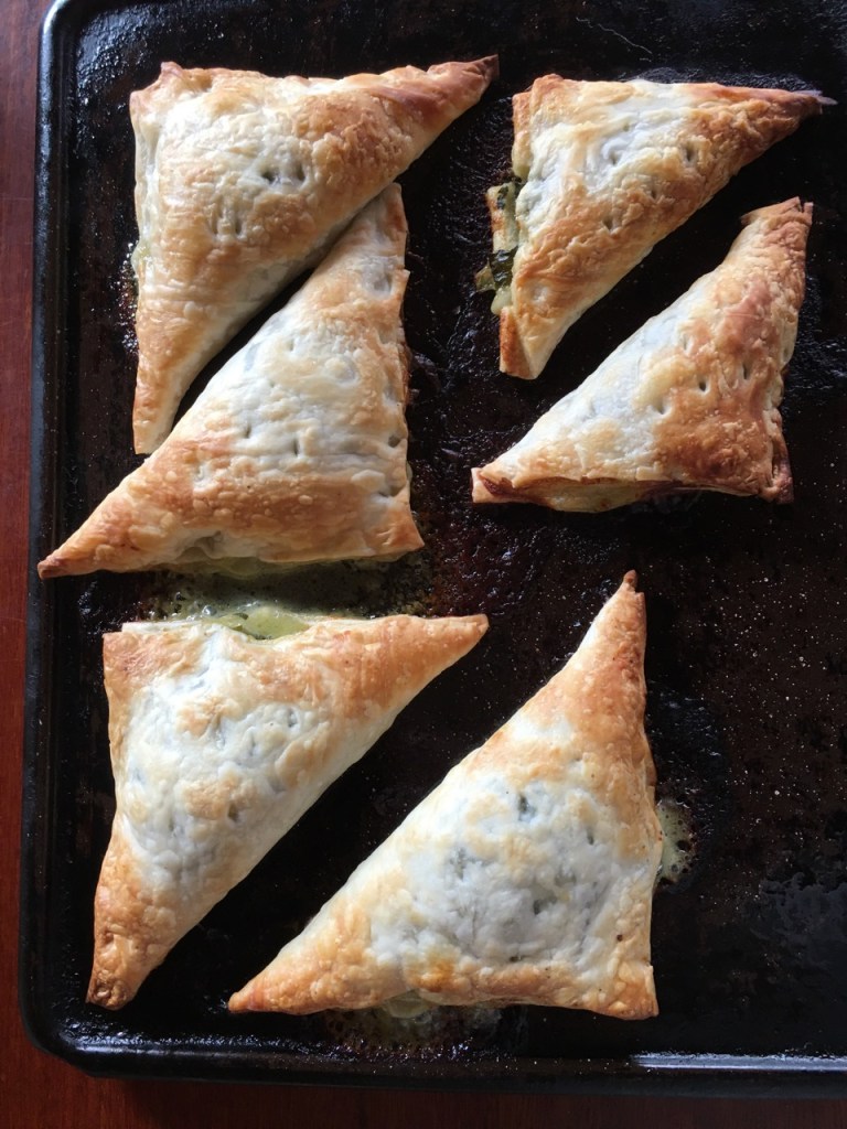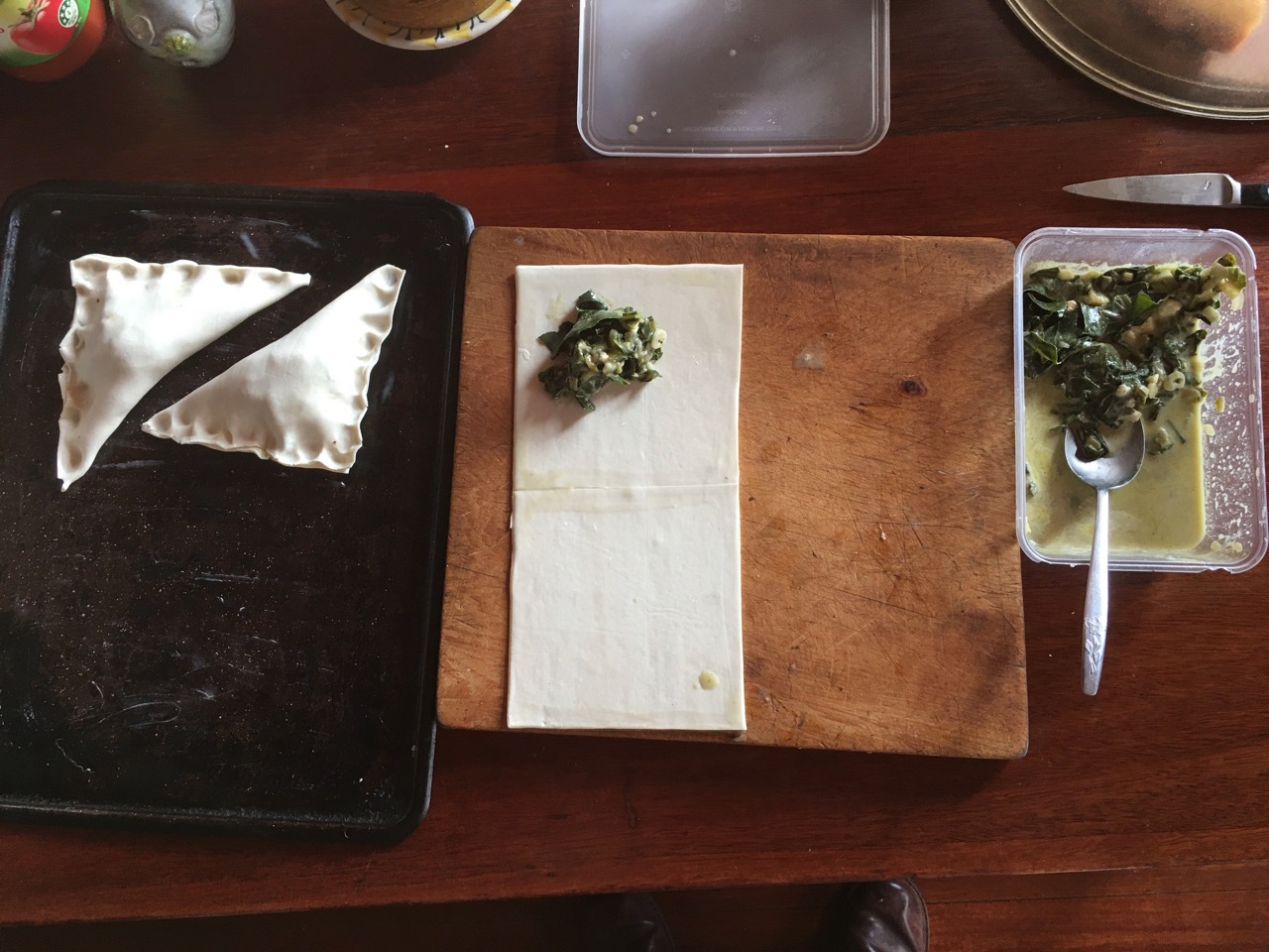 We have a little left over that I put in the fridge for lunch tomorrow. I take one sheet of puff pastry cut into small squares, add a dollop of the spinach mix and fold over diagonally, then bake at 180 for 15 mins or until golden. These little traditional parcels make a warming and easy lunch instead of a sandwich. Nothing left over and nothing wasted.