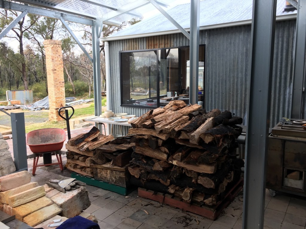 Last weekend we fired the new wood kiln for the first time. Not the best firing that I have ever had, but OK for a first firing. There is always a bit of a learning curve getting to know how a new kiln works. Becoming familiar with its particular traits and ‘personality’. We are also using pre-burnt wood from the bush fire. Burning in the kiln, what was recovered from the trees in our front garden. It’s strange and burns quite differently from the trees that we are used to burning from our forest that were unburnt.