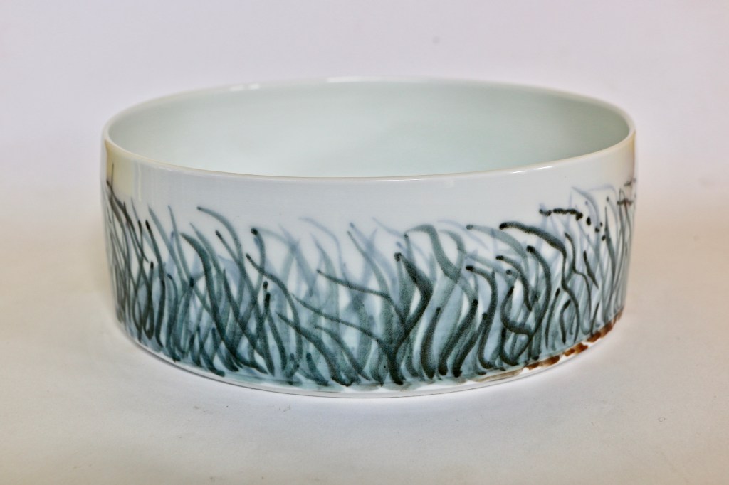 I have a few pieces of blue and white sericite porcelain in the show. These are my first experiments in blue and white in this new workshop. I have experimented with a few different recipes of home made ‘smalt-like’, cobalt based pigments. This homemade pigment is related to the Japanese ‘goshu’, or natural ‘absolute’ or ‘wad’ based mineral pigments. I have developed 5 different recipes that provide me with different intensities of blue. It’s not too sophisticated as yet, but it is a good start and just one step on the long path to a more sophisticated result.