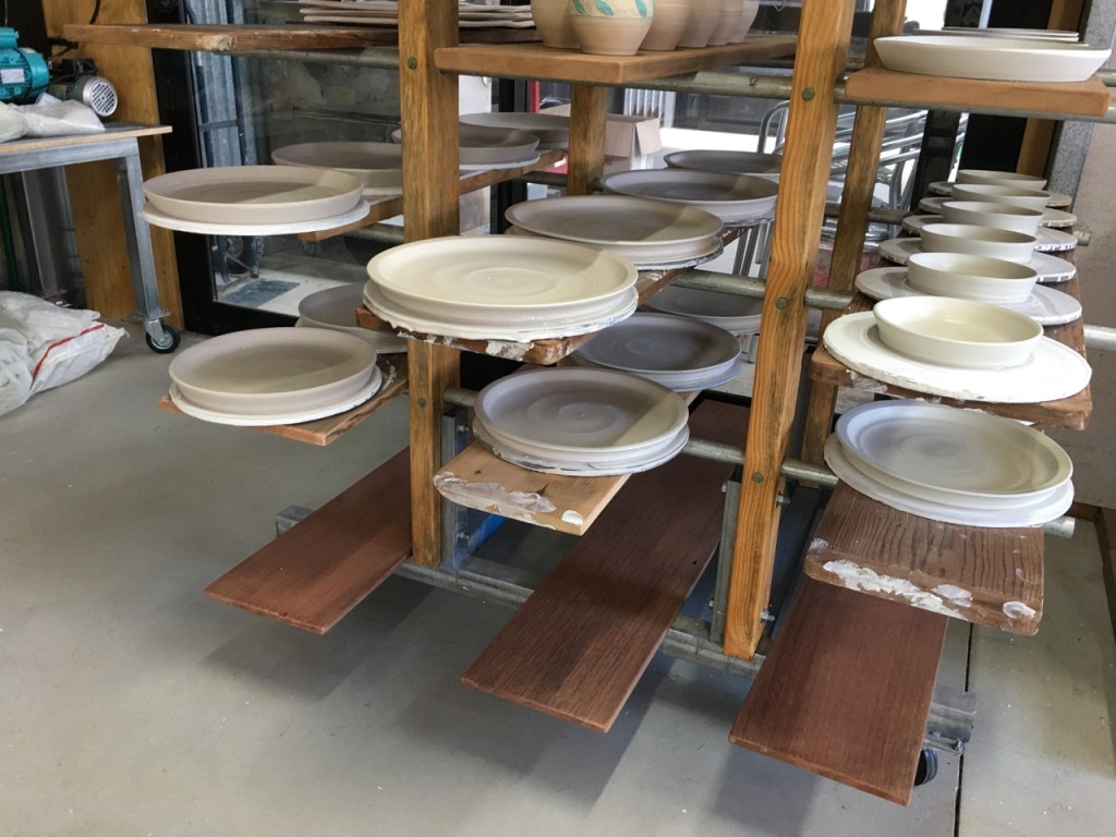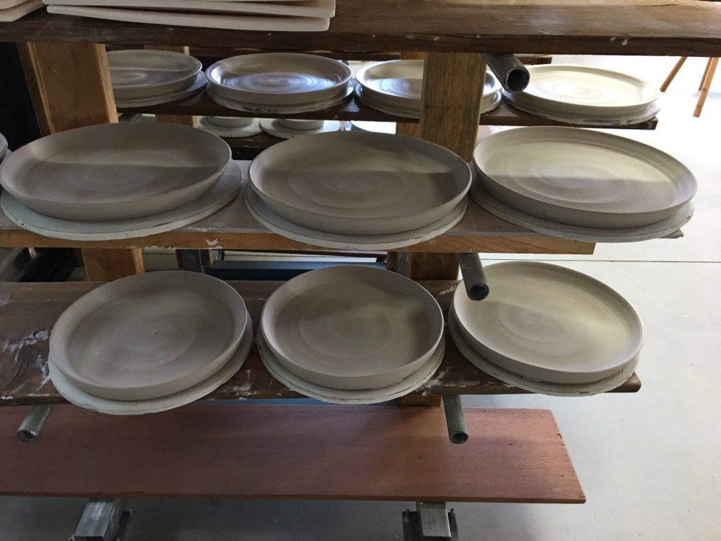 I have been making dinner plates and other flat ware, as well as bigger pieces for the next wood kiln firing. The sericite is still giving me some issues with cracking on the wide flatware.