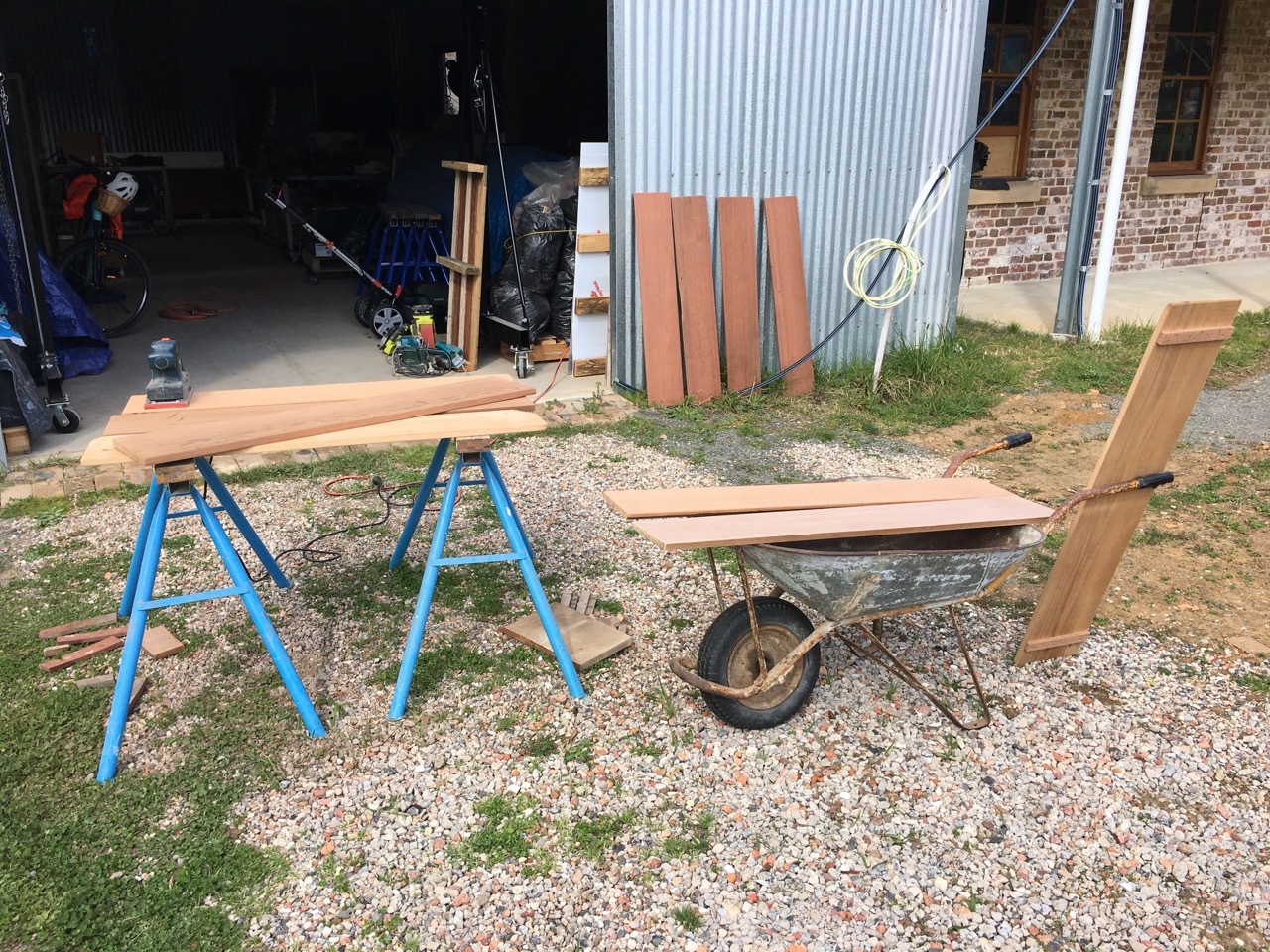 I spent half a day last week making more pot boards from old bits of flat, wide wood that was laying around. The top of an old dresser, the doors off an old wardrobe, both scrounged from neighbours on the way to the tip. More waste forestalled. Then 4 red stringy bark planks that I have had put away since the 80’s that were destined to be doors on a kitchen dresser that I was building in the pottery. The dressers all gone in the fire, but the 4 wide red planks remain, It’s a good thing that I never got the doors built, so the timber is now some of our new pot-boards. The main thing is that they are straight and flat and clear-grained.