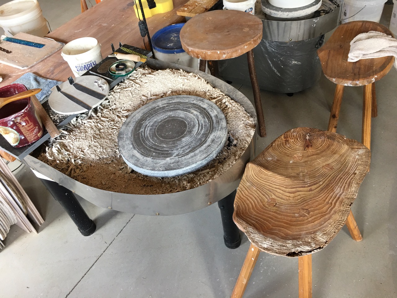 I had to throw all my pots off-the-hump, on a Shimpo wheel with no tray. As I couldn’t sit cross legged, on the floor, in front of the wheel, for very long without getting cramps. I had to dangle my legs down beside the wheel, into the enclosure, to be comfortable. I didn’t want my legs to get wet, so I learnt to use virtually no excess water. I’ve become a bit lazy in my old age and let a few drop slip off the wheel head these days. As it doesn’t matter, because I have a large tray to catch everything. Old habits die hard.