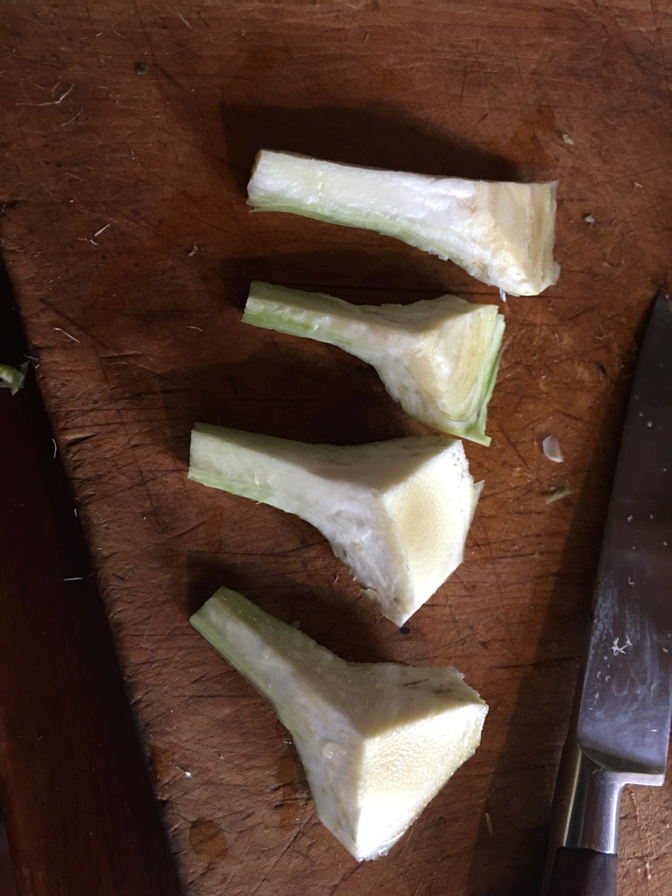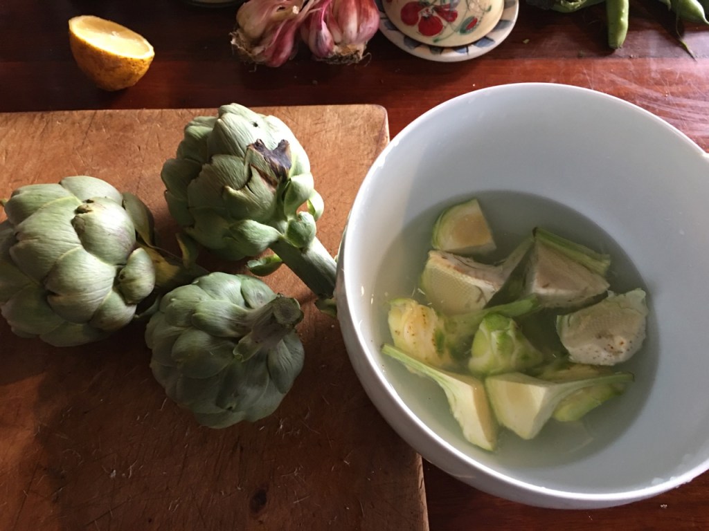 I cut them and trim them down to the essential core of flavour and drop them in lemon juice acidulated water, eventually to make a pasta sauce out of them with our home-made tomato passata sauce from last summer and some little zucchinis and broad beans from the spring garden.