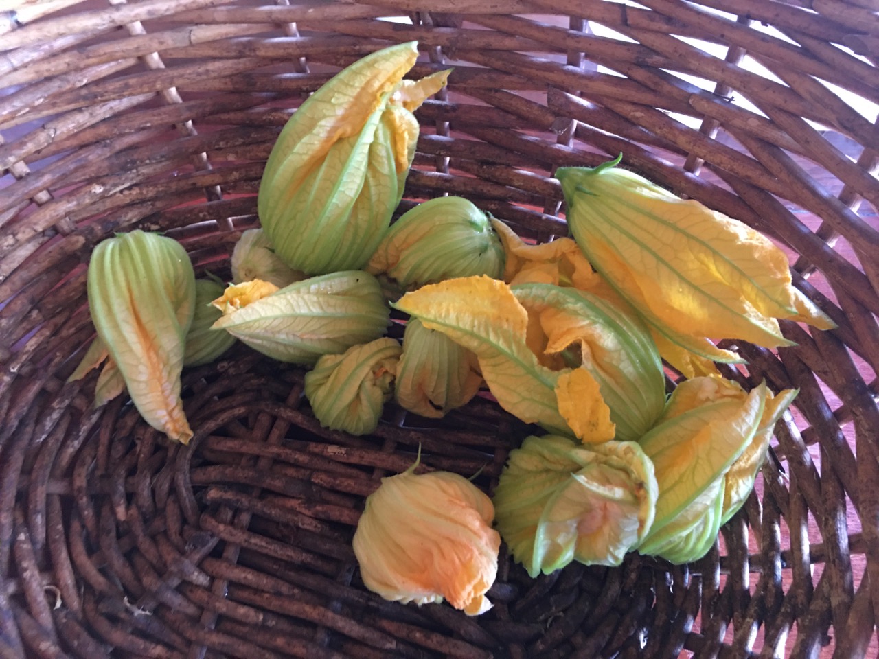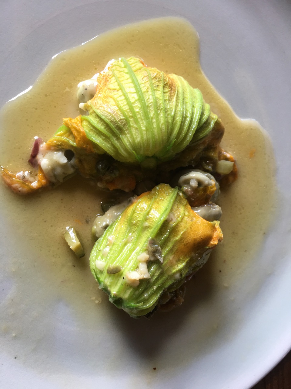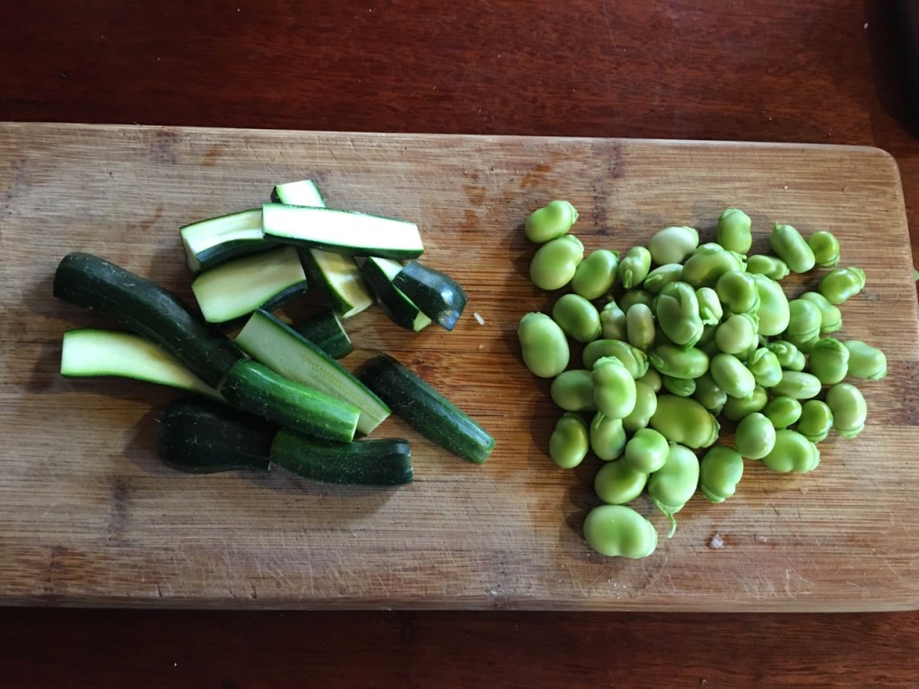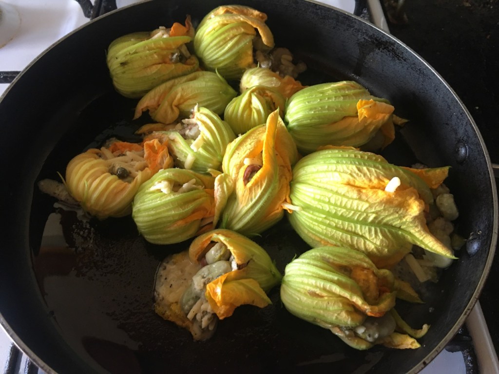 I stuff the zucchini flowers with broad beans, olives, cheese and some chopped gherkins. Not my filling of choice, but I am committed to use what we have in the garden and live with the seasons. We have a lot of broad beans at the moment, and