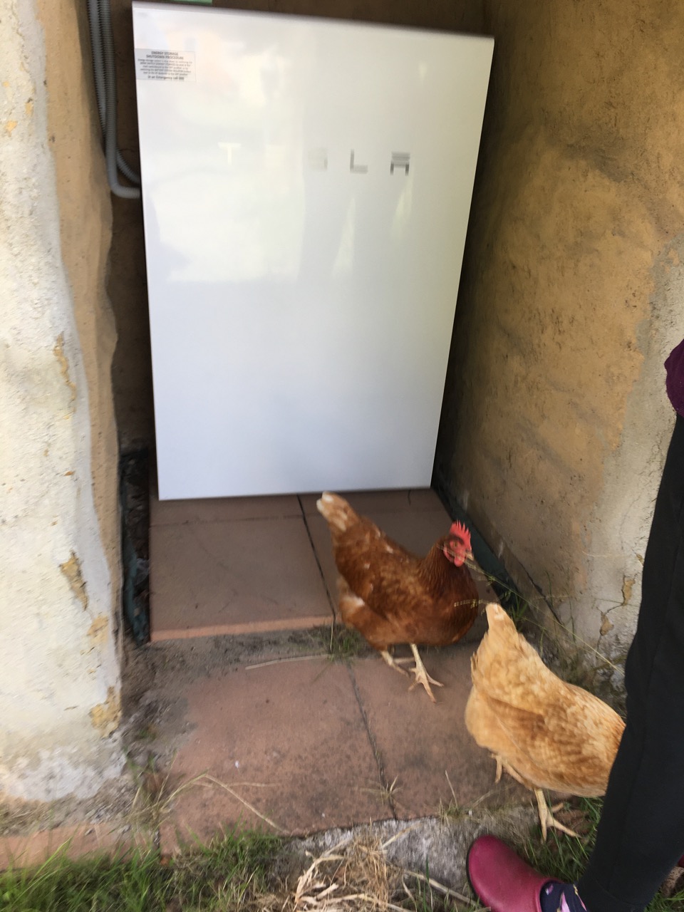 The chickens come out to see the new Tesla Battery. Perhaps they want to know what it is like to be a battery hen? They don’t appear to be very impressed. Battery hens! What’s all the fuss about?