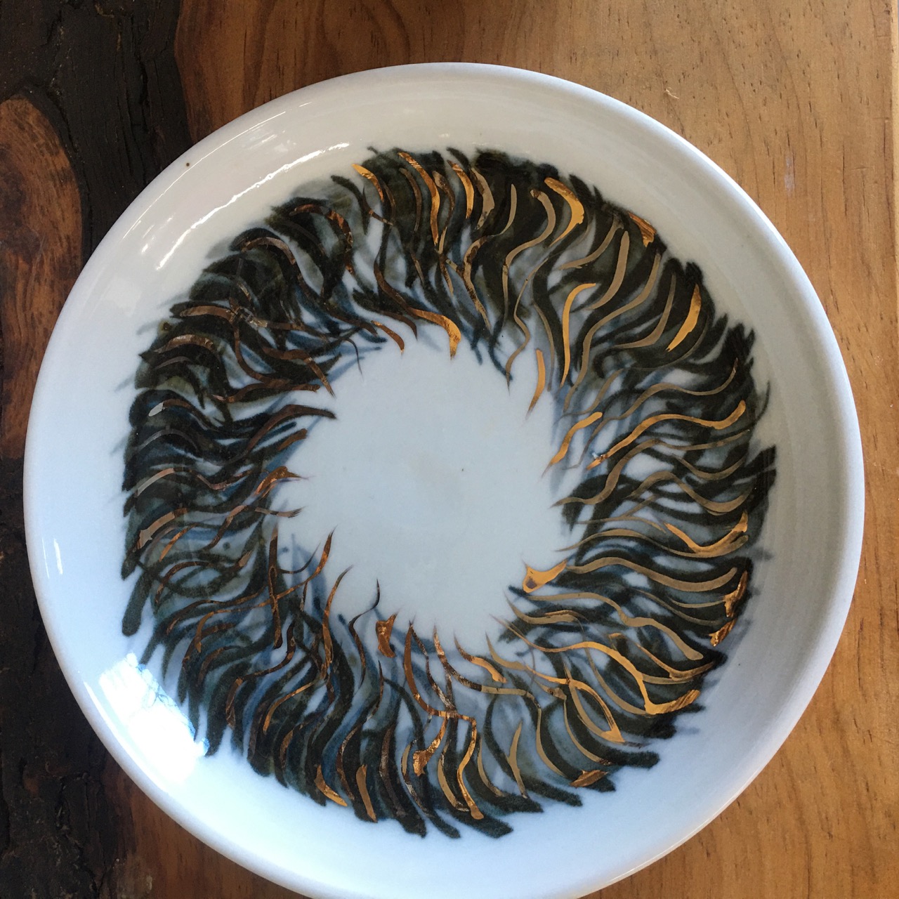 The initial home-made cobalt goshu pigment and gold lustre design.