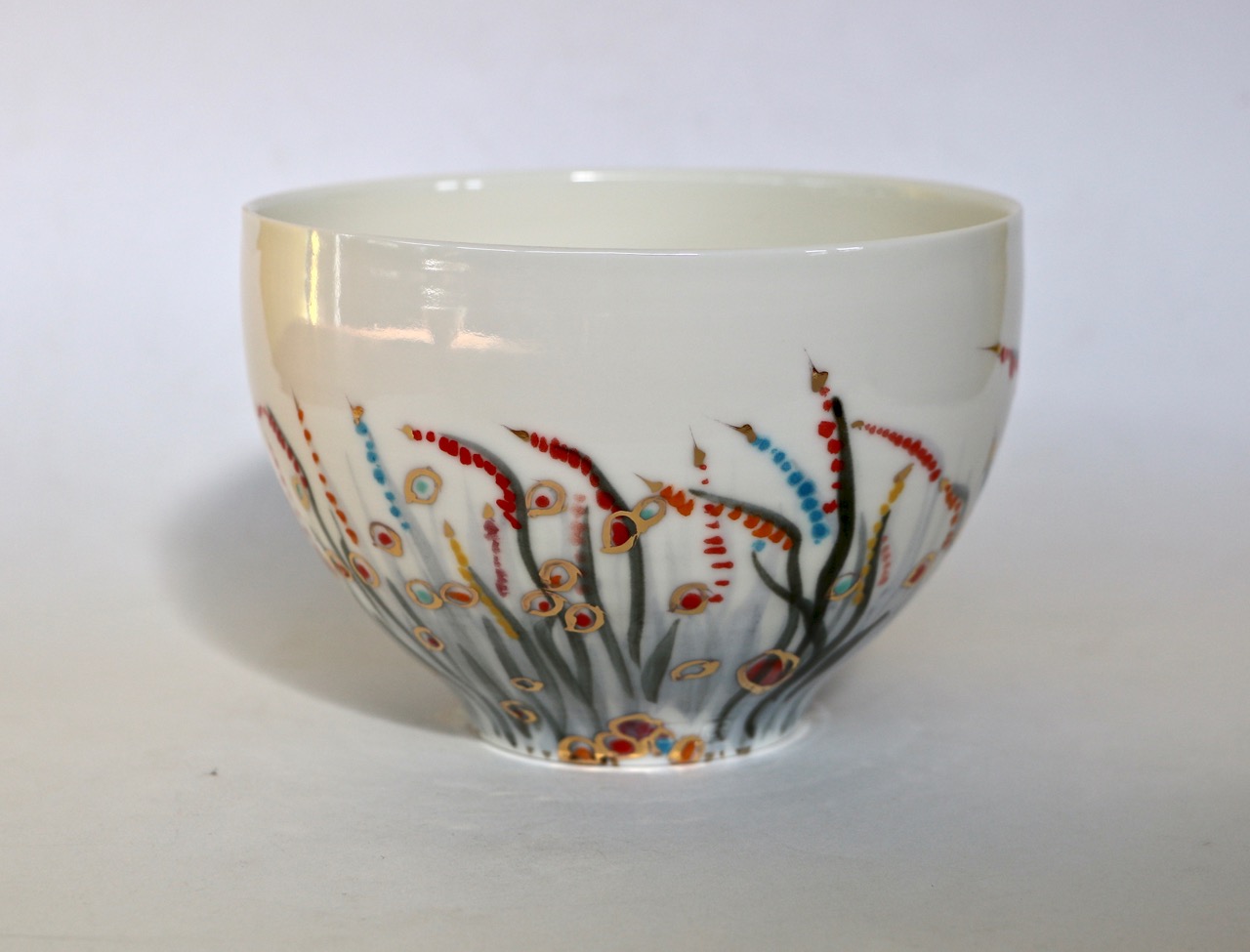 I was painting the stylised bush fire flames motif that I had developed and have been working on for some time. The sort of gestural image that crops up in my dreams. When I suddenly realised that over the few recent pots that I had been working on. The image had subtilely changed from an improvised flame image, slowly but surely, to an image of garden flowers.