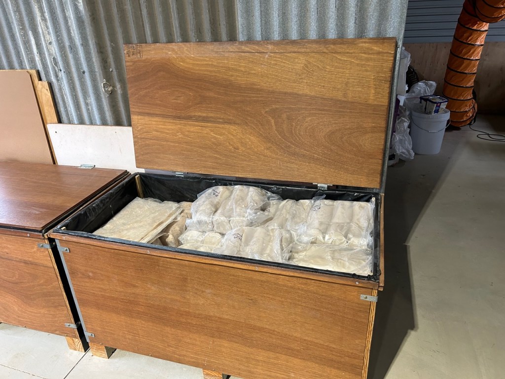 We set up the hand-building room as our lunch room, I made a table out of a very large slab of wood from one of our trees that was killed by the fire. And rather than waste it. I couldn’t bear to see it bull-dozed, chopped up and burnt, so I hired a portable sawmill for 3 days and we milled the trees into all the planks and slabs that we needed to build the new pottery.
