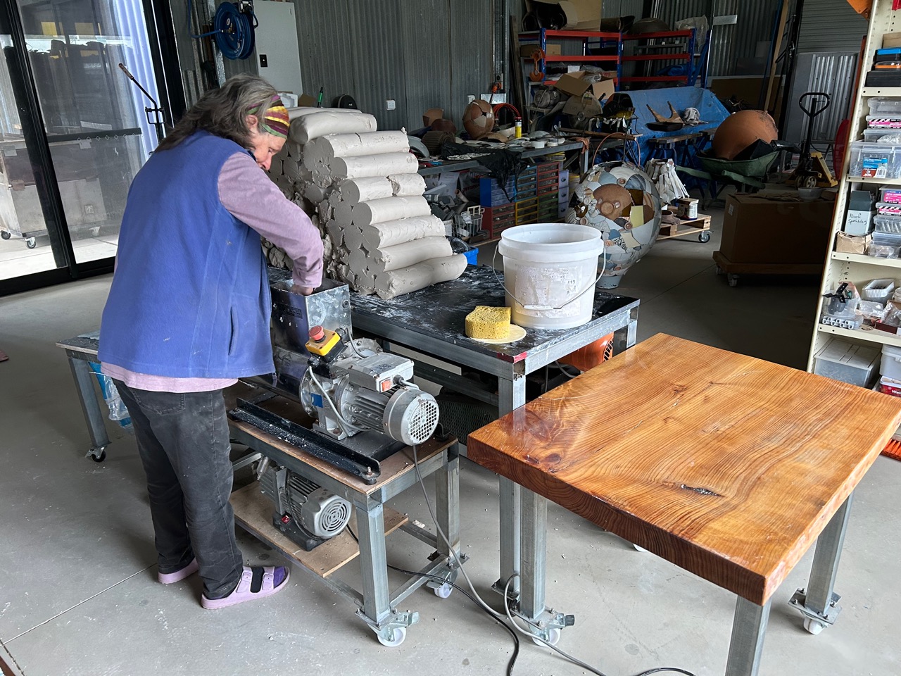 We set up the hand-building room as our lunch room, I made a table out of a very large slab of wood from one of our trees that was killed by the fire. And rather than waste it. I couldn’t bear to see it bull-dozed, chopped up and burnt, so I hired a portable sawmill for 3 days and we milled the trees into all the planks and slabs that we needed to build the new pottery.
