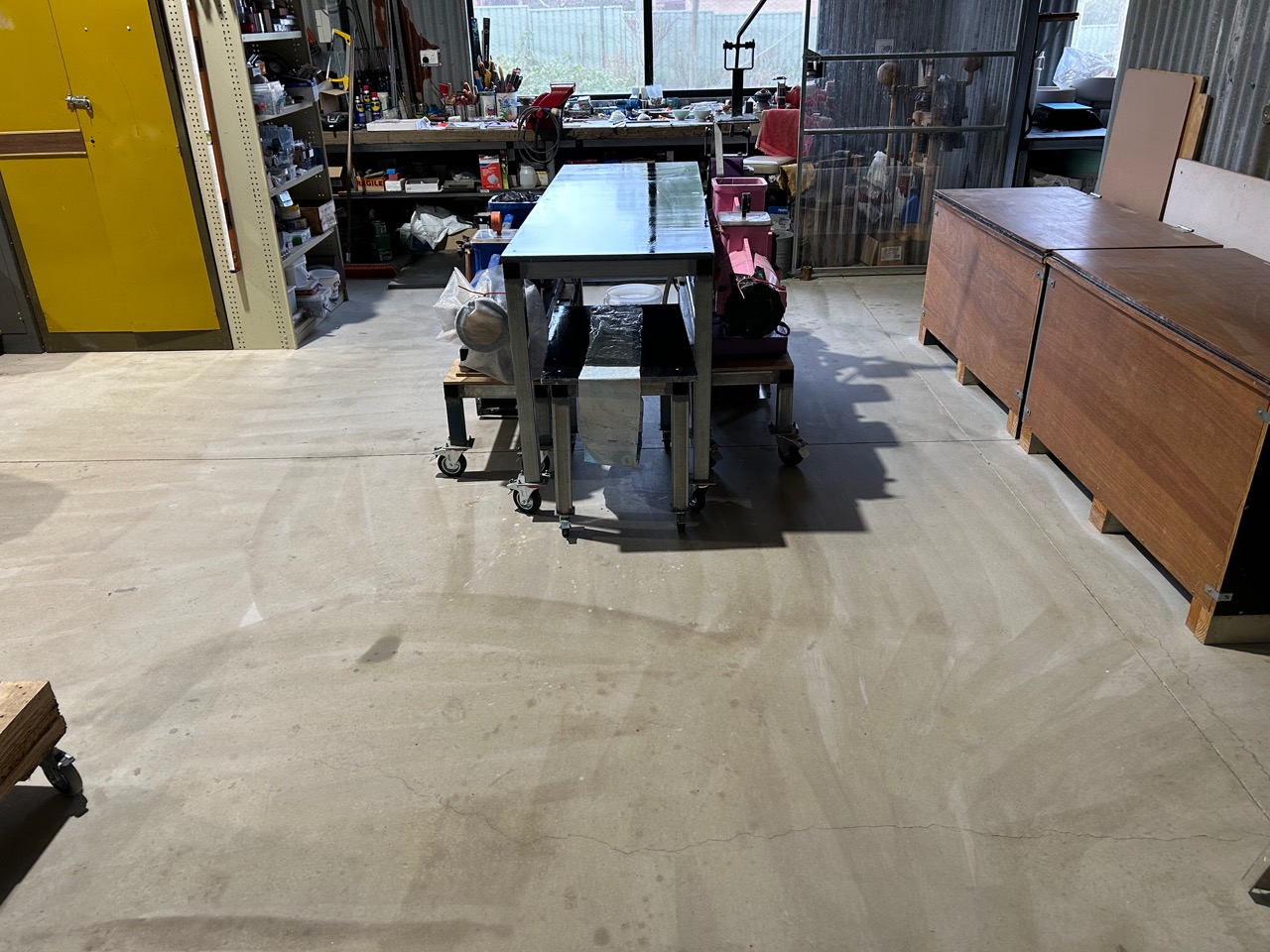 This solid table is one big slab of timber that can seat 12. We use this room for functions, dinner parties and openings. Our house is small, so if we need to sit more than 6 guests, we move out into the pottery where we can seat 12 to 14 at a pinch. It’s a large bright, well lit room with loads of practical, flexible space, so it has become an extension to our house in some ways.