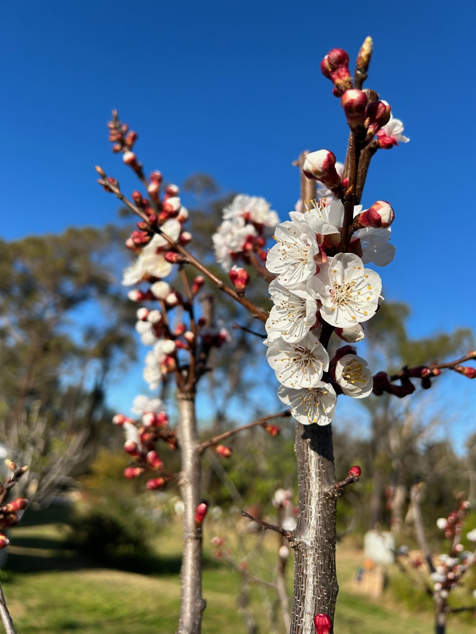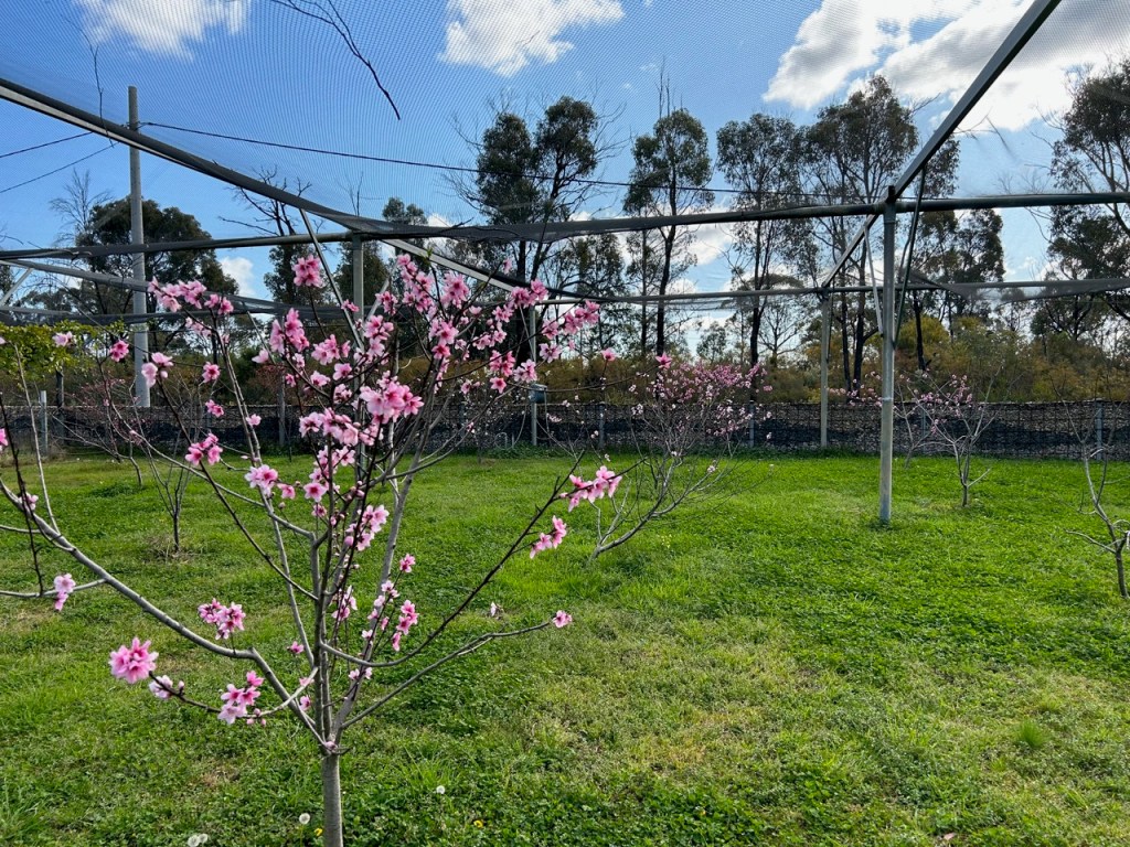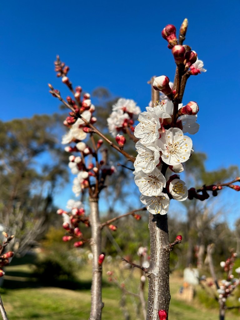 The stone fruit orchard is growing up well. This is its 3rd year and the trees are starting to look a lot more settled and established, with thicker trunks. I have been pruning them into open vase shapes where possible, but some of them have a very narrow vertical habit. They are all grafted onto ‘dwarf’ rootstocks, so they are keeping to a compact size. Most of them are now about 1.5 to 1.8 metres high, with an expected total height of 2.5 metres eventually. But I am well aware that plants can’t read their own labels! So there are bound to be variations.