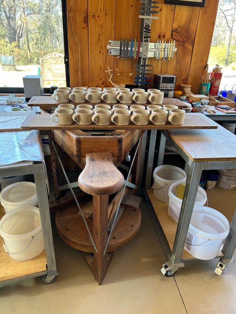 We had a really great 1st Weekend workshop in the new pottery. It worked very well. The new studio is a great space to teach in. The light is good and the layout works ergonomically for 10 people, 8 students and 2 teachers. After everyone left I got stuck in and started making more pots for myself. The Open Studios, Arts Trail is coming up at the end of the year, so I need to get back to work making pots for that. I started back at it by making 30 straight sided mugs.