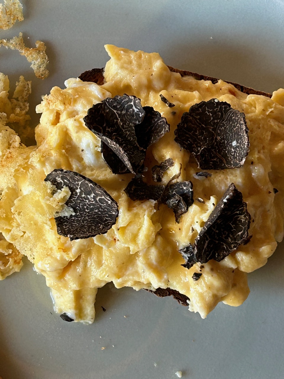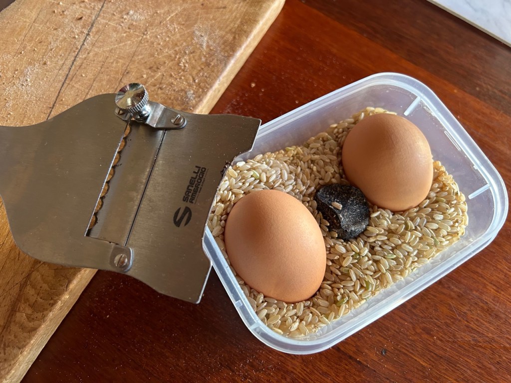 Today we finished off the last truffle of the season. It was romantic, mysterious, fragrant, exotic and delectable. It really elevates the humble scrambled egg into something special without taking anything away, just adding loads of romance and aroma. The warmth of the freshly cooked eggs releases so many aromatic oils and esters from the tiny black fungus. It fills my nostrils as I bend over doing the shaving. It’s a good thing that we only get to eat these delicious little morsels in the winter months, otherwise we may become somewhat blasé about it all. As it is, they are still a very special seasonal treat, If somewhat expensive. We can only afford to live this decadent gourmet lifestyle on our frugal budget because we have a son in the industry.