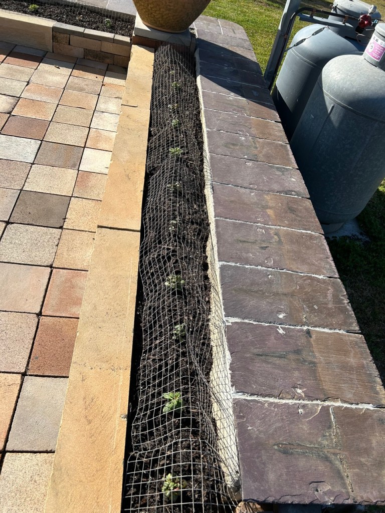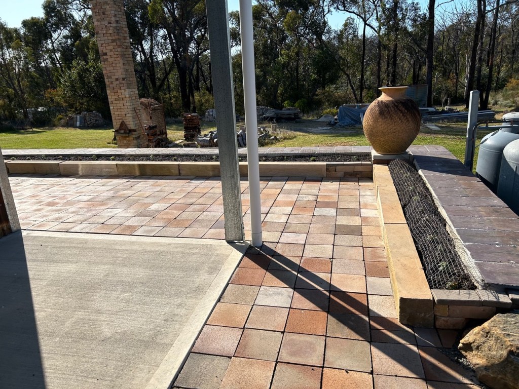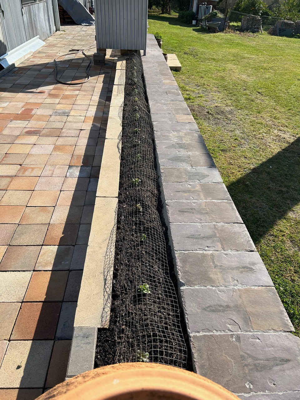 I spent a few days since the recent weekend workshop, in the afternoons, in my spare time, splitting and dressing sandstone blocks, to make some garden bed edging along the recently finished slate capping on the big sandstone retaining wall around the new pottery. It’s just another one of those jobs that has been in the offing and waiting for the ‘right’ time. I chose this ‘right’ time from what is left of my other time! Once the little wall was in place I shoveled in a load of top soil and planted seeds and a few seedlings to make the edging look a bit more settled and finished. I sprinkled in a packet of English Cottage Garden seed mix for good measure and 30 caper seeds, one every 600mm. Capers need an elevated, well drained, sun baked, dry, harsh environment to thrive. They take 2 years to establish, then persist for many more as long as they are cut back and pruned hard in the winter to stimulate good growth in the spring and summer, as flowers and fruit are produced on the new years growth. The elevated and exposed wall seemed like a pretty good place to try them out. I have read in a few books that they thrive on top of stone walls in the Med’s dry summers. I have no expectations, but if something comes of it, I’ll be pleased. If not, then I’ll chalk it down to another one of life’s enriching experiences. The stones look nice anyway, regardless of whether the plants grow or not!