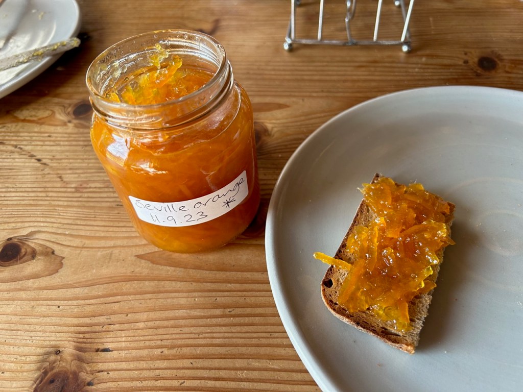 Janine removes the pith and cuts up the juicy centre to add to the pan. The first pan is on for 30 mins. before we get the 2nd pan on the stove and the difference in colour is dramatic, it gets richer and deeper as it cooks. We try to use as little sugar as possible, while not making it too bitter and acidic, we also need enough sugar to make it ’set’. It takes about an hour of steady simmer to get it to thicken sufficiently. It’s worth all the effort, it tastes delicious, with just the right consistency. Seville oranges aren’t all that nice on their own. They are OK, but they really come into their own when it comes to making marmalade.