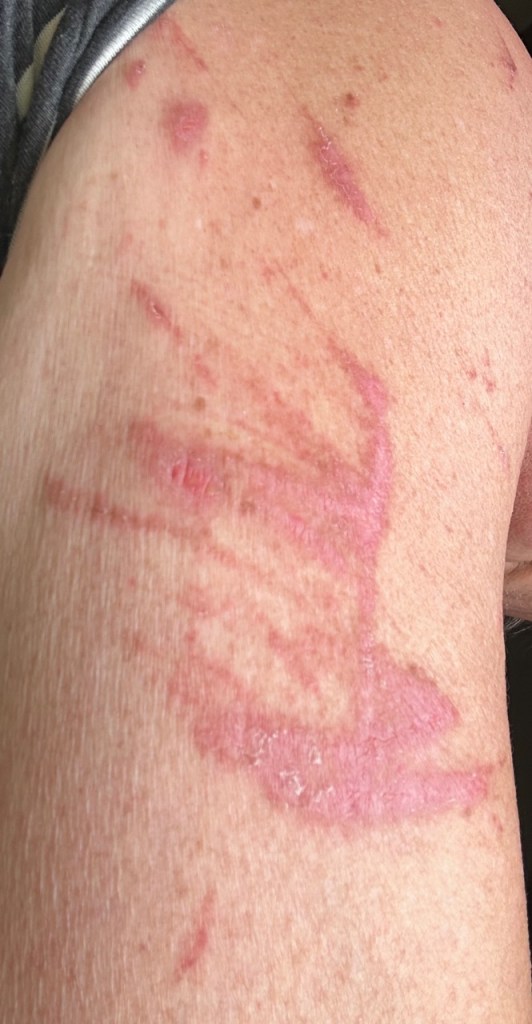 Now 2 weeks on its settled down and is no longer so red and angry looking, and the clear pustules have gone. My GP comes back to work on the 2nd, so I have an appointment with him then. But it’s left me living with the symptoms of flu or COVID, even though it isn’t that. I have achy joints, electric blue razor sharp headache, and feeling pretty tired most of the time.