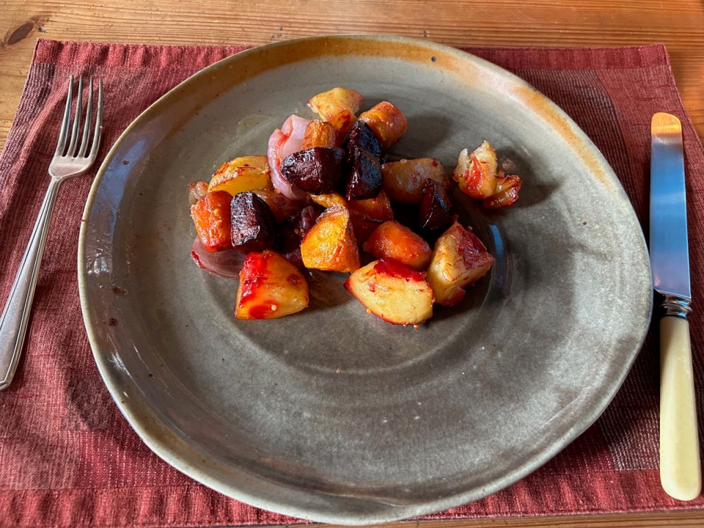 Having spent a week in bed, with the symptoms of what I first imagined were the same as covid, but with sun burn on one arm, it’s been a very quiet one for me. The big solstice day fell just at the end of the week, so I was able to take part in our beautiful family Xmas lunch of baked garden vegetables in a honey soy dressing, with a garden/orchard salad of red plums with cucumber, capsicum, tomato, red onion and parsley. All really delicious, cooked on sunshine and no animals were hurt in this meal.