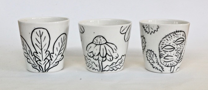 These red and black cups are experiments in a combination of Sgraffito and inlay.
