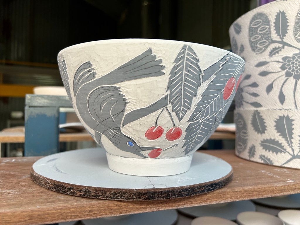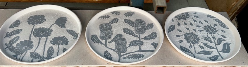 I’m enjoying the sgraffito decorating technique that I learnt from my friend Warren Hogden a few months ago, when Warren and Janine taught a sgraffito slip decorating workshop here. I was the TA, assisting at that workshop. But I was really engaged and enthused, so have tried my hand at this lovely, gentle technique, and I’m really enjoying it.