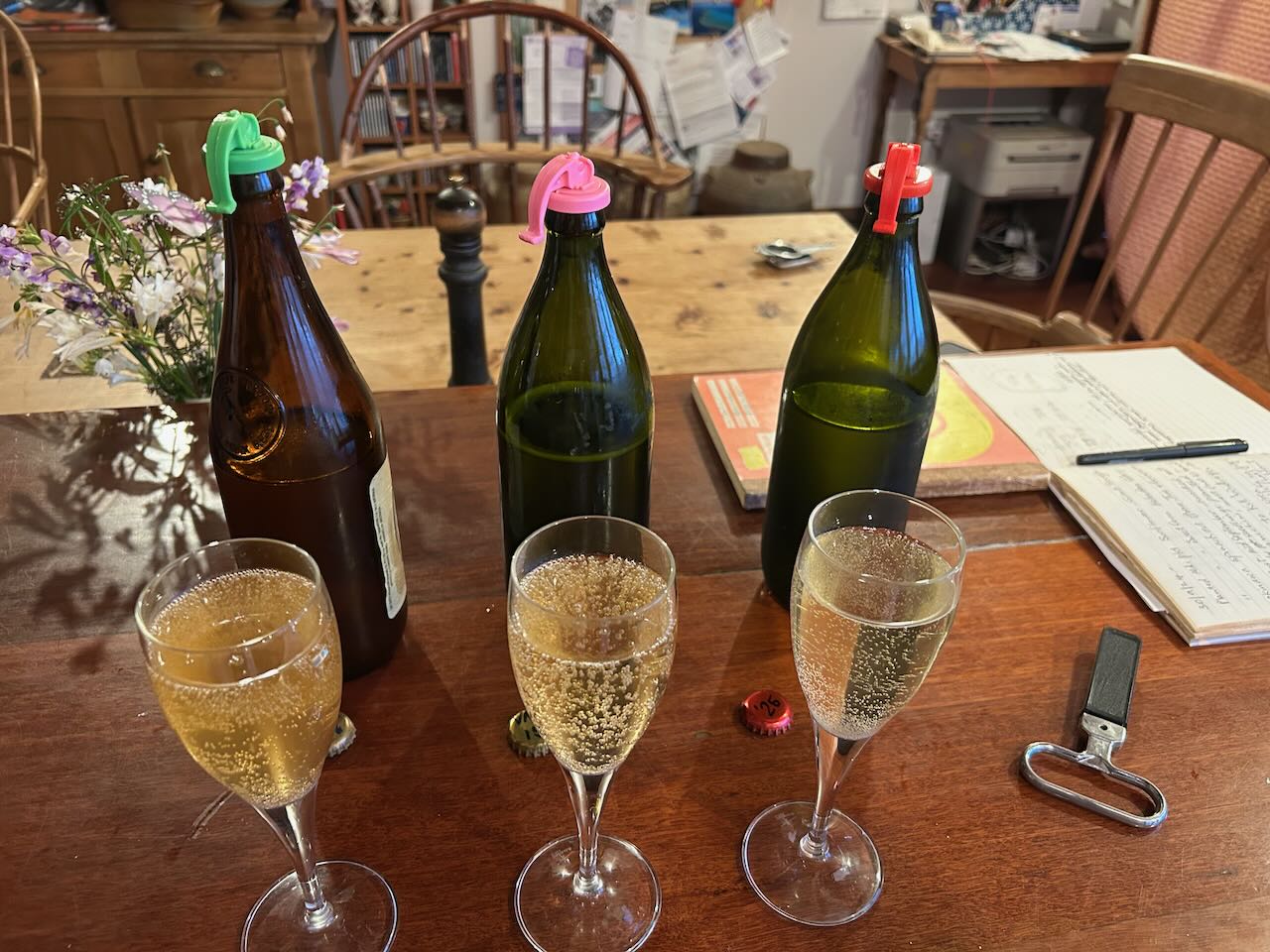 I always leave the cider in the fermenter for 2 months to make sure that it has completely fermented out all the available sugars and is ‘dry’. Over the past 4 decades, I learnt to add one spoonful of white sugar to each bottle at bottling. This is the standard champagne bottling technique. This is to allow it to re-ferment, just enough to make a sparkling cider. Because these are all new trees and therefore an unknown fruit. I played it safe, and only added half a spoonful of sugar at this first bottling. So this batch has only a gentle spritz, but this is better than too much.
