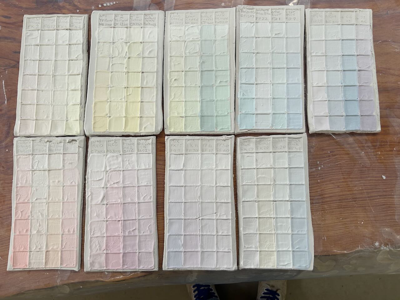Weighing out glaze tests can be quite boring, especially when it goes on for days. However, it keeps me gainfully employed in the warm and dry pottery studio. I put on a CD while I work. It takes more than the length of a CD to fill one test tile with the infinitesimally small gradations of ingredients in the logical progression of the recipe. Each tile is 8 x 4 squares = 32 weighings and recordings.That’s 288 tests made in this sitting. Enough!