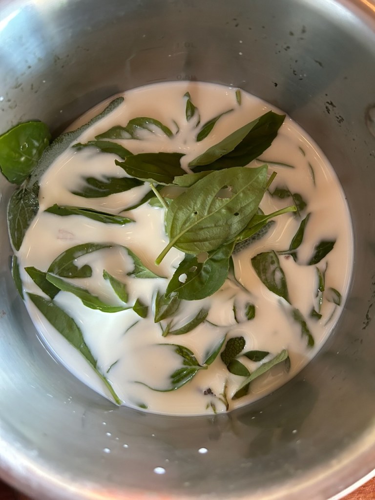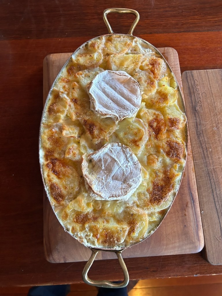 I simmered the herbs in a little bit of milk to draw out the flavours, then layered the finely sliced fennel and potatoes with sour cream and poured the strained milk over and through it all. I finished the dish with a camembert cheese placed on top to melt through the dish. As if the tub of sour cream wasn’t quite enough, and topped it off the some grated 36 month aged cheddar. I was happy with it and no one complained.