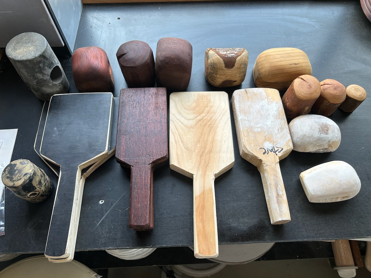 All the timber now looks rich and glorious! While I was in wood working mode, I made a pile of paddles and wooden ‘anvils’. To be used in the coming workshop for forming and securing the joints of large pots. I made everything from off-cuts and prunings of trees in the garden and orchards, including apple, pear, cedar, juniper, pine and banksia.