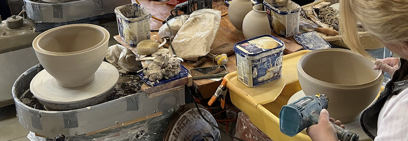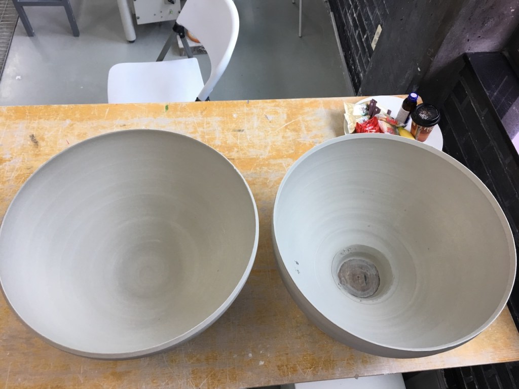 The beauty of this technique is that you can ’stiffen’ the bottom section by heating it a little. But make sure to measure it first. Then you can invert the top section straight away and continue throwing. This means that the form is still ‘fluid’ and can be reshaped slightly to make sure that you have a unified overall form. It is quite forgiving, but only up to a point. Don’t over do it, or you’ll loose the lot. Apart from being unattached to the pots that you are making, the other lesson of the week is to know when to stop.