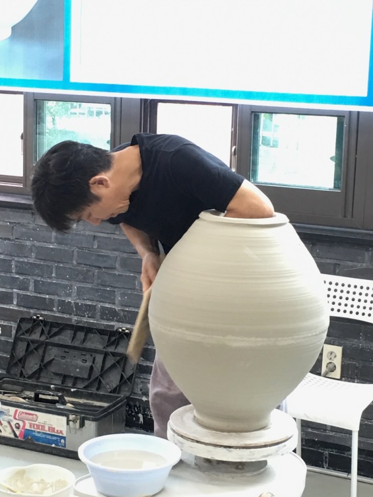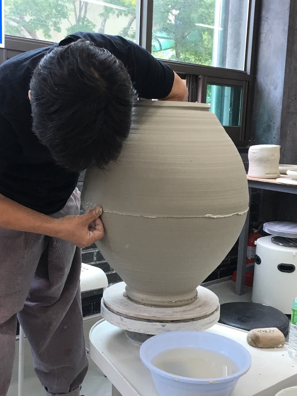 That said, it is the technique taught in Korea’s prestige ceramic university ‘Dangook’ university. I have watched the technique of the master thrower – Professor of Moon Jar making – teaching a throwing class using this technique. As long as you get everything level, concentric and perfectly aligned, it is the easiest to master. He made the two half-pots one day and assembled them the next. So that they were slightly stiffened. He used thick throwing slip slurry on the joint.