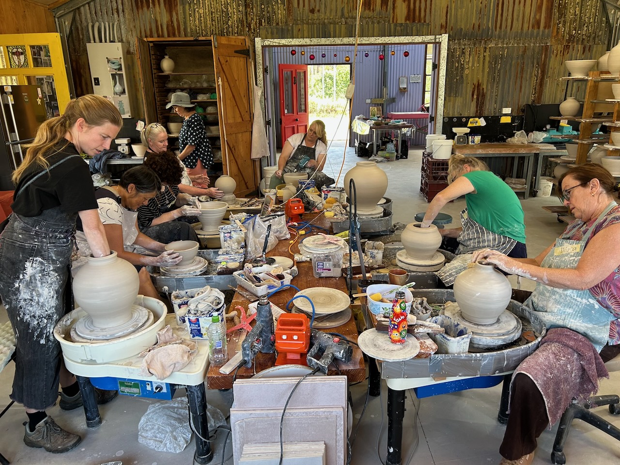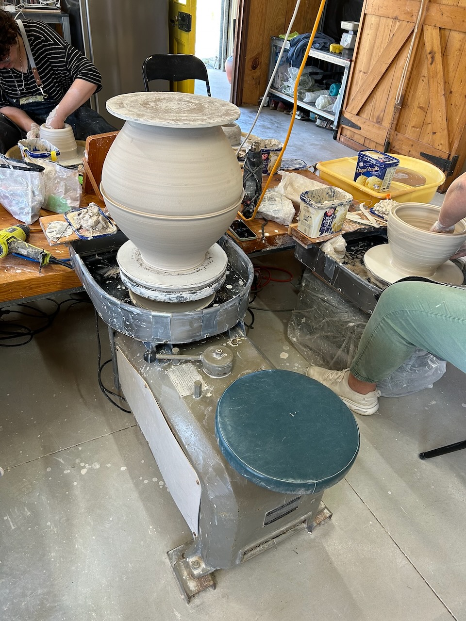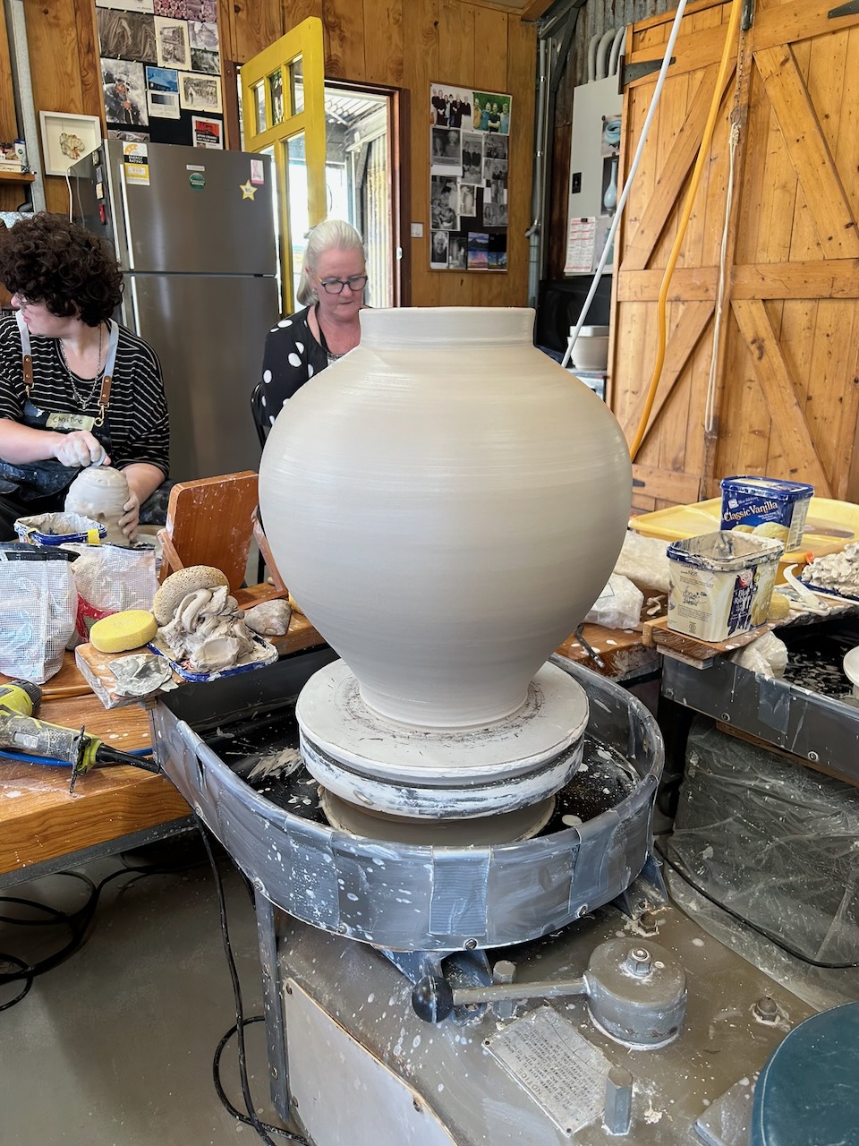 So I decided to teach this two part technique. We started with 1 kg to 1.5kg, then added another kilo each day, ending up with 4 kg. The object wasn’t to make full size Moon Jars. The purpose was to learn the technique of throwing and joining fat round forms. Repetition is very important in learning. We practised ’non-attachment’, if the pot wasn’t going well, then it is best to put the clay back through the pug mill and start another one. Some of these students came here last year to learn to make tall joined forms, so were familiar with the workshop and one of the joining techniques.