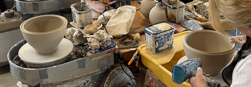 The next level of difficulty is the tongue and groove ‘V’ joint, where the rims of the two halves are thrown with a ‘V’ shaped hollow in the base section rim. The female part?, and the other half, the top section, is thrown with a ‘V’ shaped pointed top on the rim. The male part? These two complimentary sections fit together perfectly(hopefully), and marry up to make a very sturdy joint. But! Only if they are well formed and accurately measured. The ‘top hat’ technique is used to join the two bowl forms. The base is firmly secured to the wheel head, then the other half is picked up by the batt on which it was thrown and quickly inverted and placed on the bottom half. Remember not to cut the top half bowl off its batt until it is inverted and placed on the lower half!