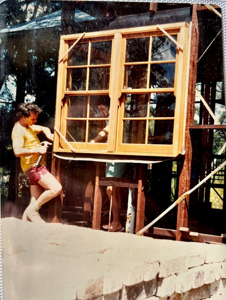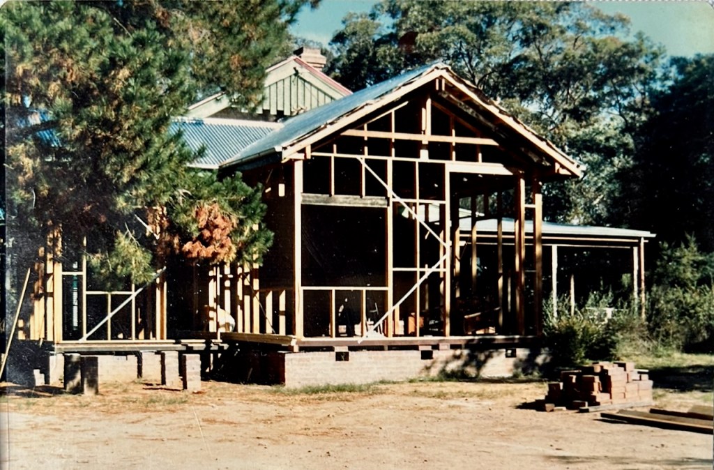We did all the construction work on our own to save employing trades. I drew up our own house extension plans myself and got them through Council’s planning dept (after a few corrections). We dug the footings and cast the concrete. We had a wheel barrow brigade of friends and neighbours on that day to help move the concrete. In the 70’s we all pitched in together on each others building projects around the village.